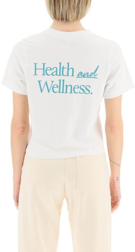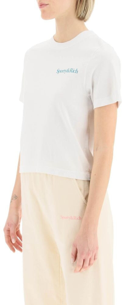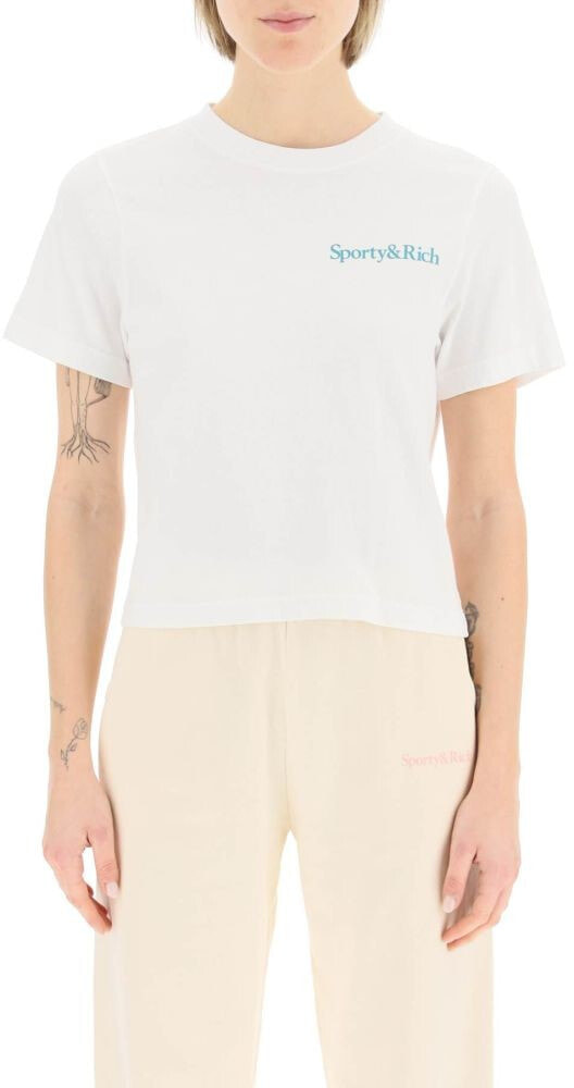 Sporty & Rich cropped t-shirt in pure cotton jersey, embellished with lettering print on the back and logo print on the cheest. Ribbed crew neck, regular fit. The model is 177 cm tall and wears a size XS.