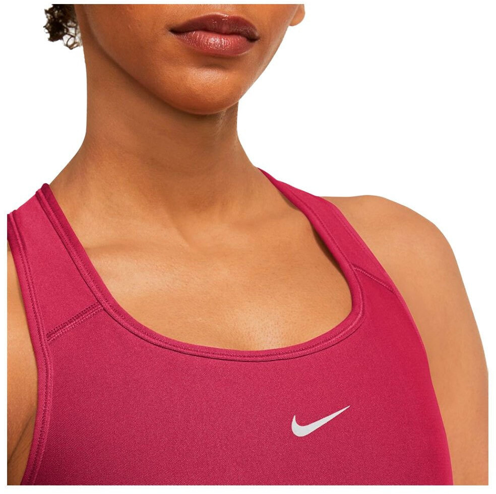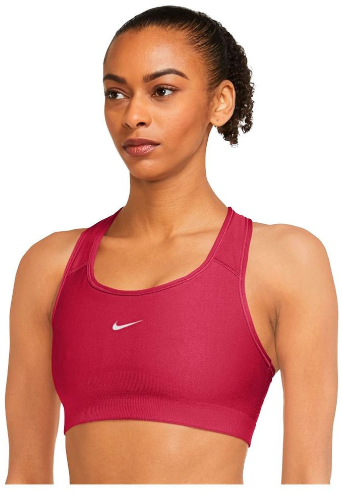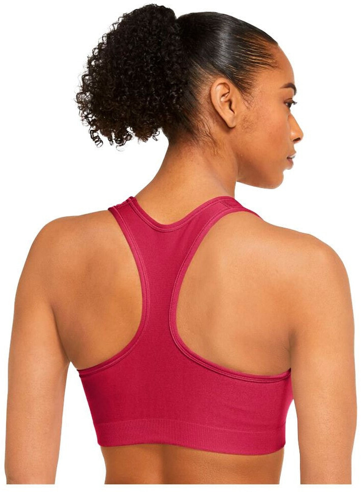 With wide, comfy straps in a in a virtually seam-free design, the Nike Dri-FIT Swoosh Seamless Sports Bra feels snug and secure while you move.