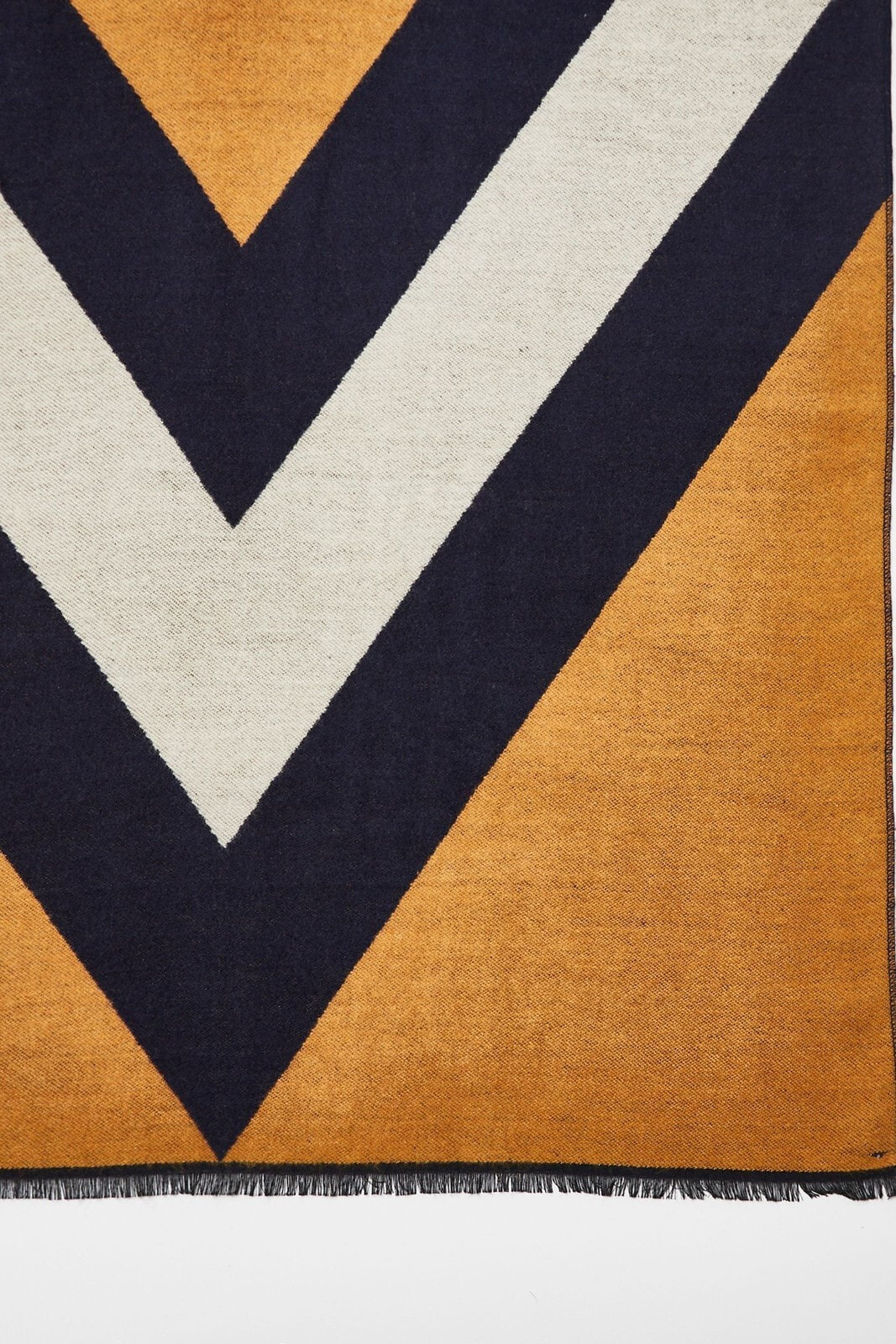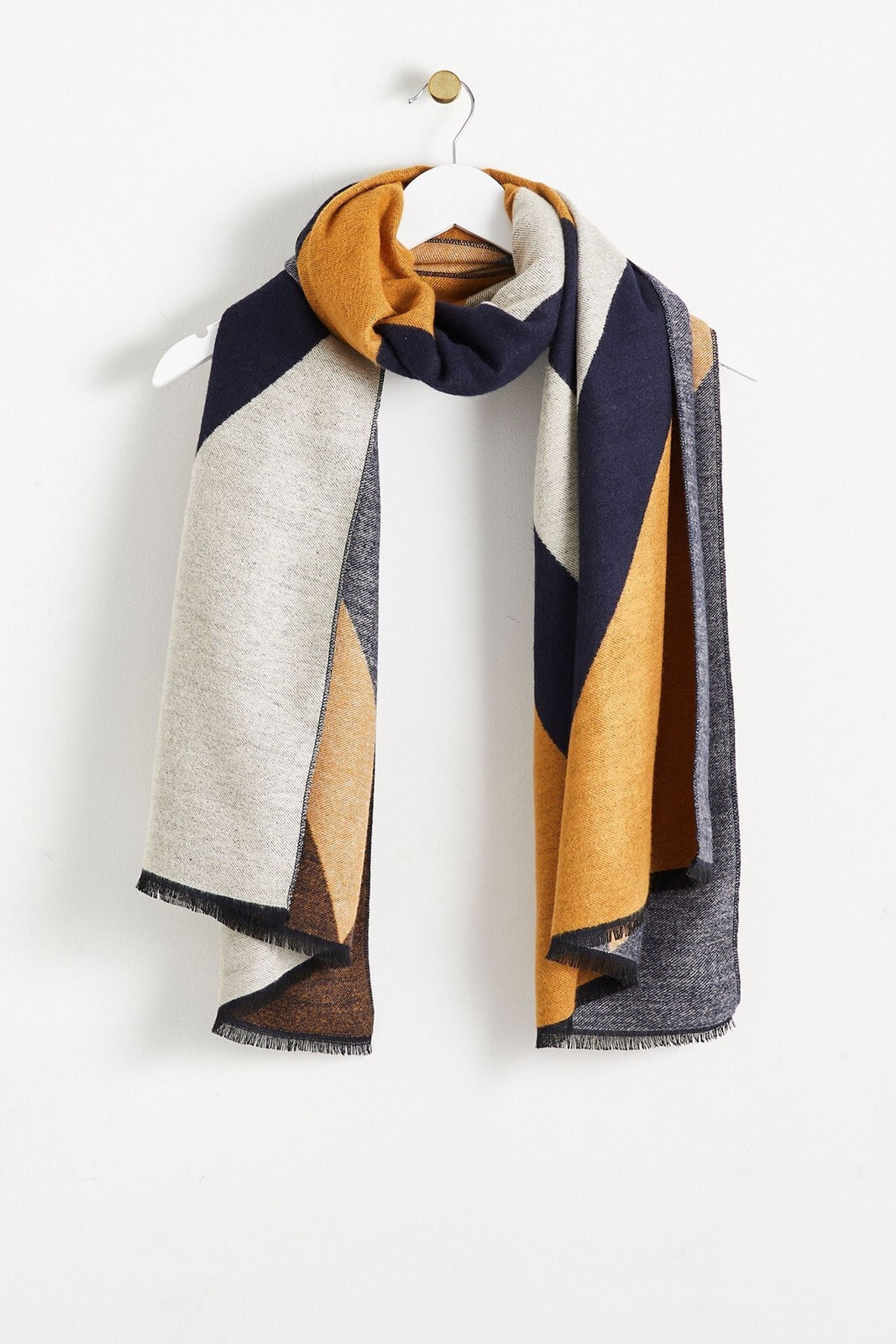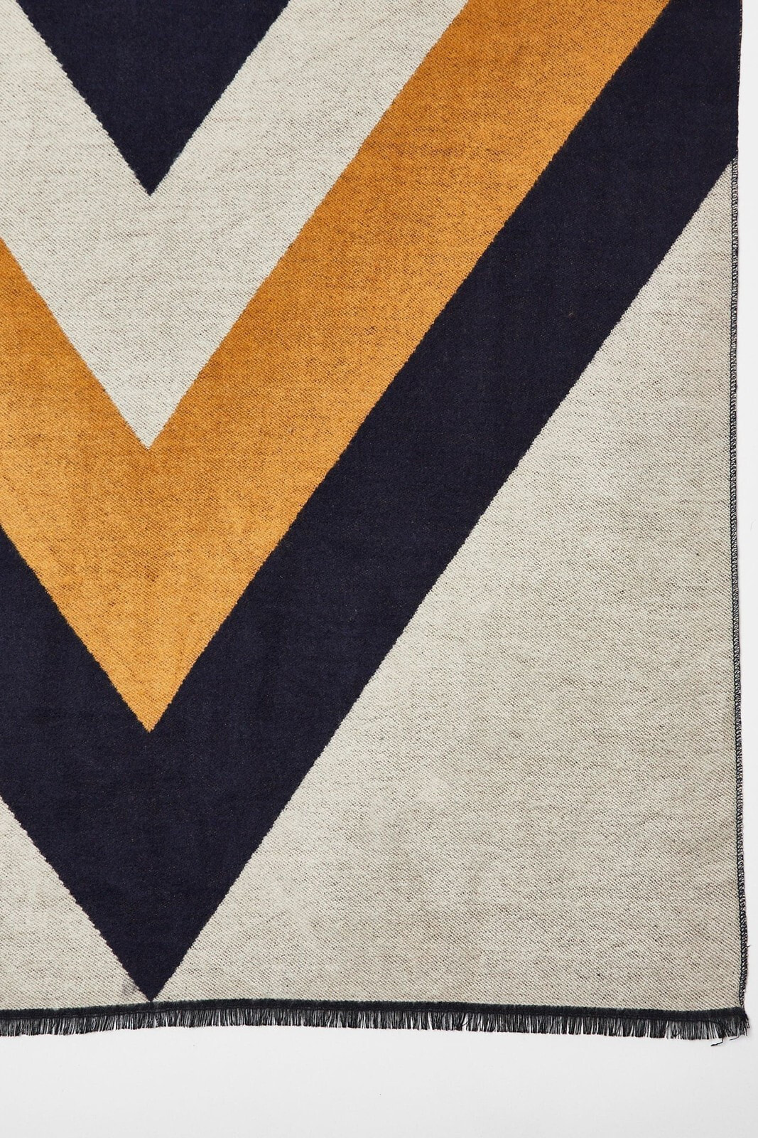 In a colourblock jacquard fabric, this navy blue, grey and yellow scarf is made with raw edges and in a midweight fabric.