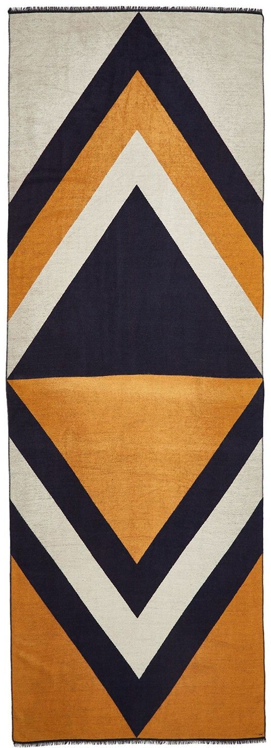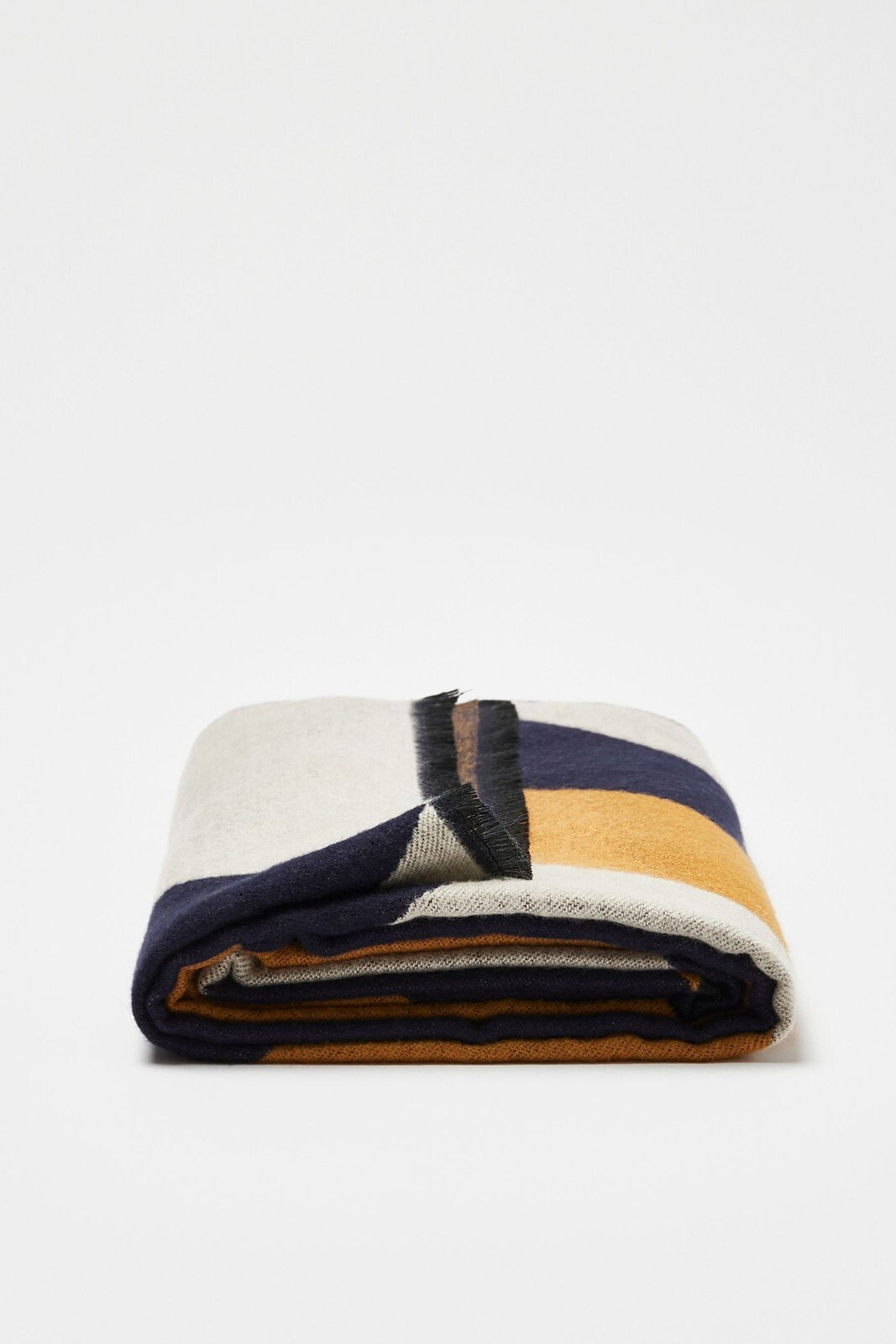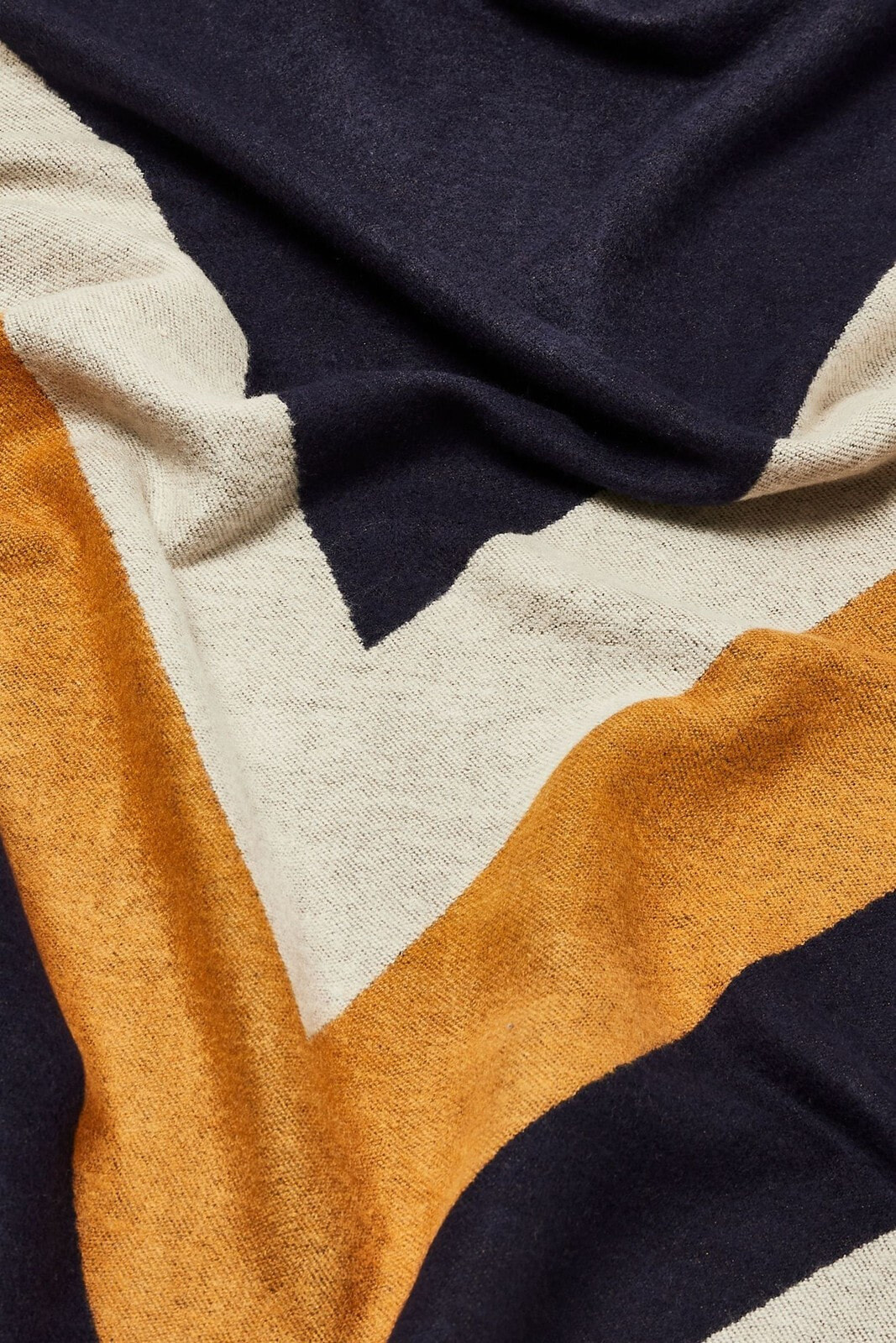 In a colourblock jacquard fabric, this navy blue, grey and yellow scarf is made with raw edges and in a midweight fabric.