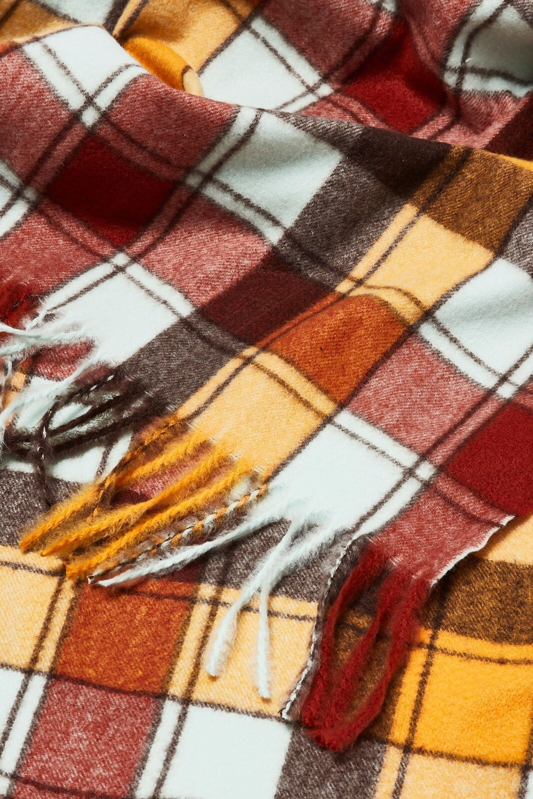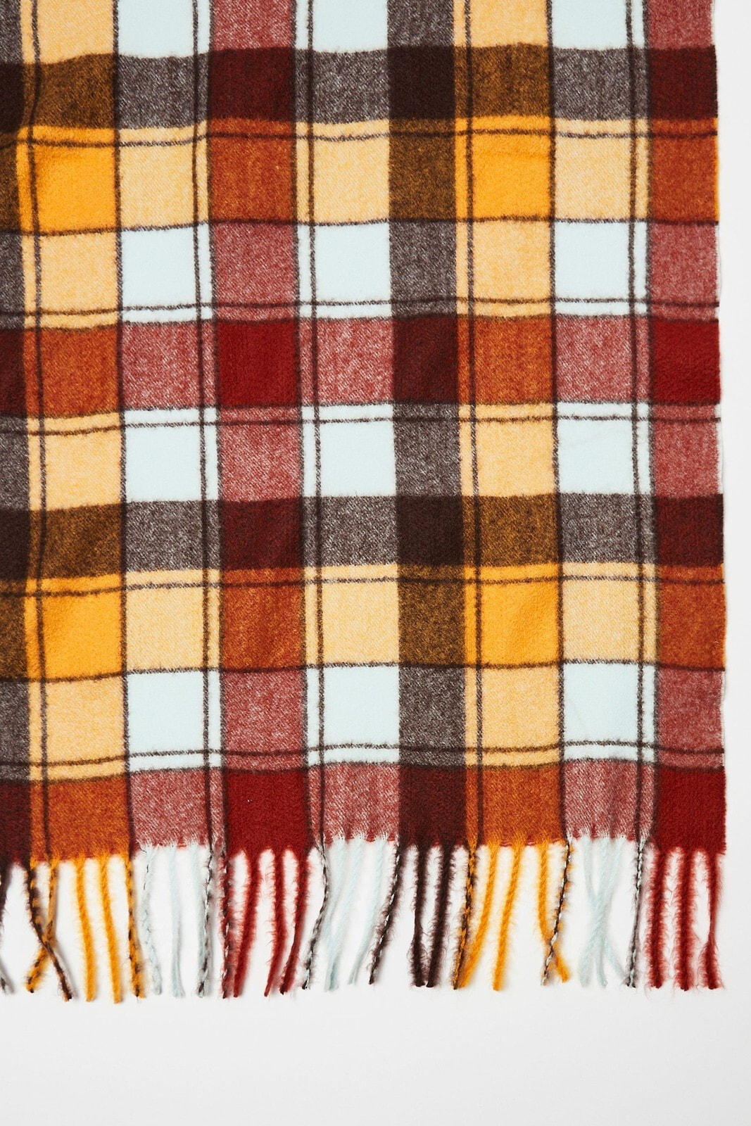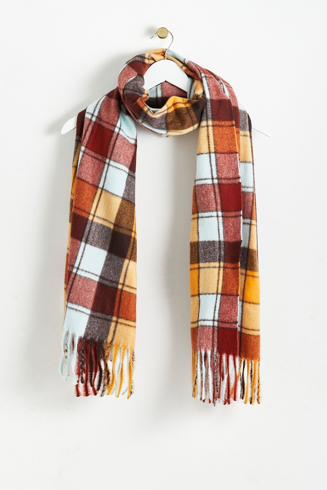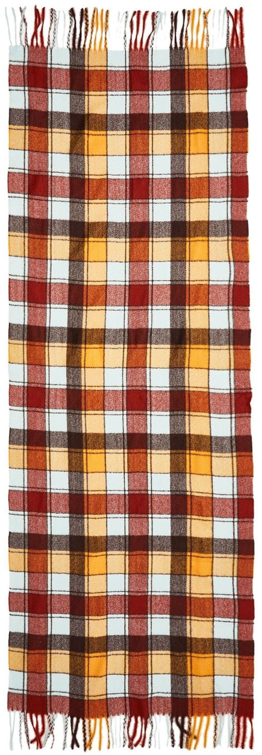 Be bold with this brown and yellow gingham scarf. Complete with tassel edges and made in a midweight material.