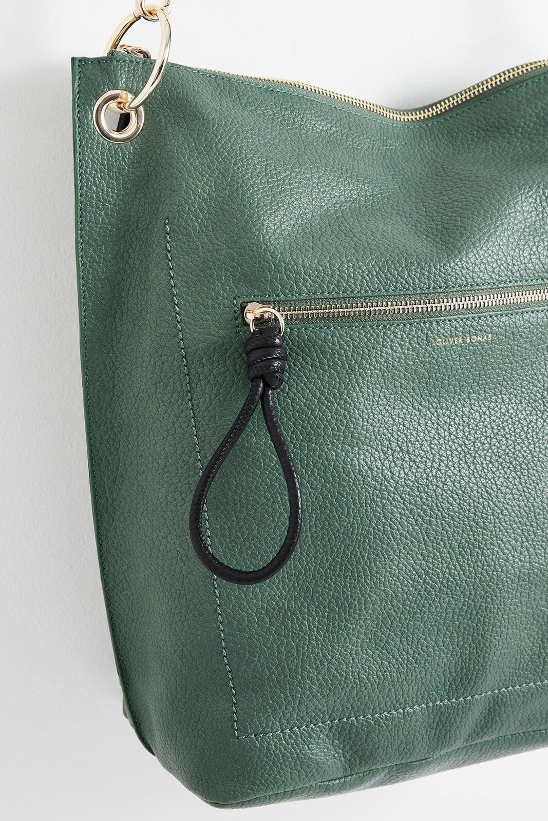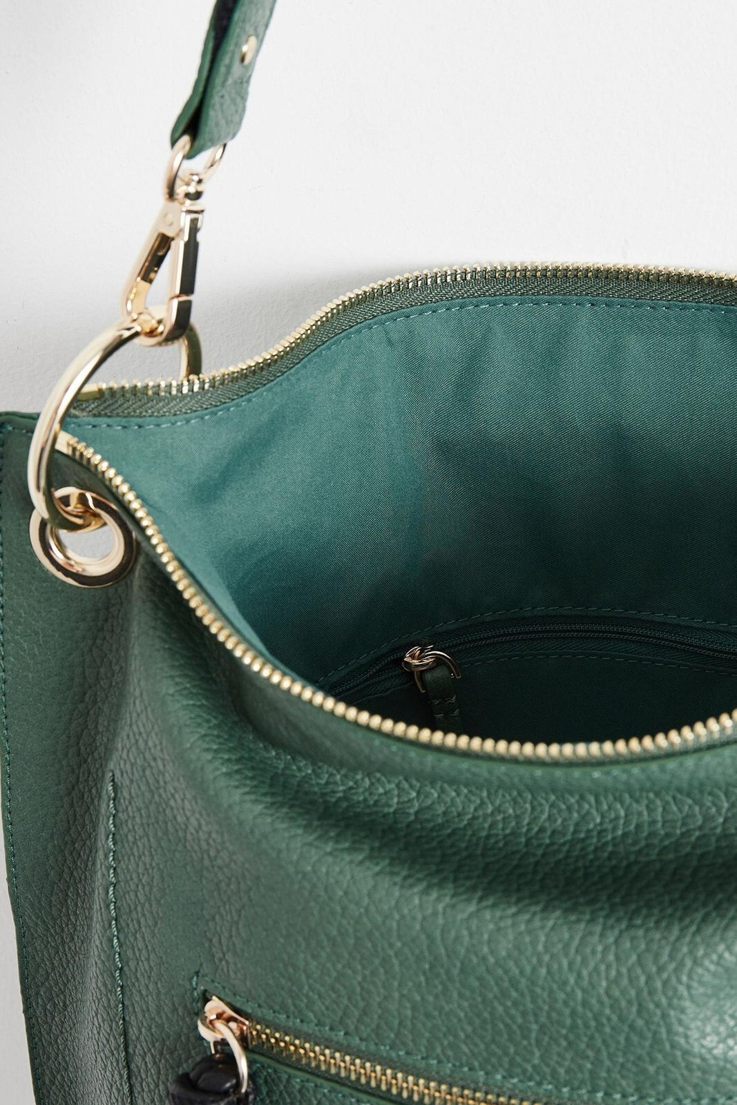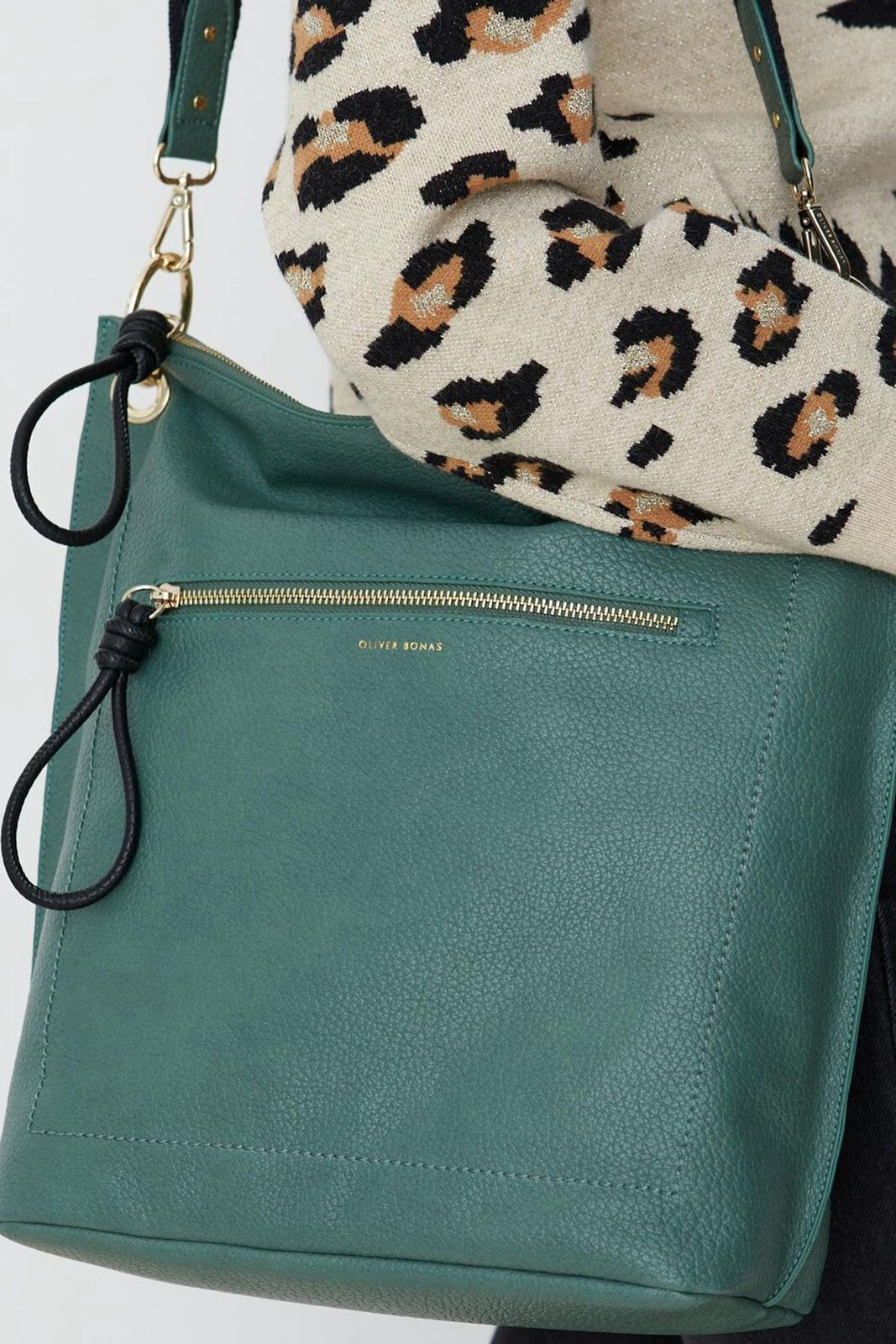 In a square silhouette, this teal green tote bag features a detachable black strap and is complete with zip fastenings and golden hardware.