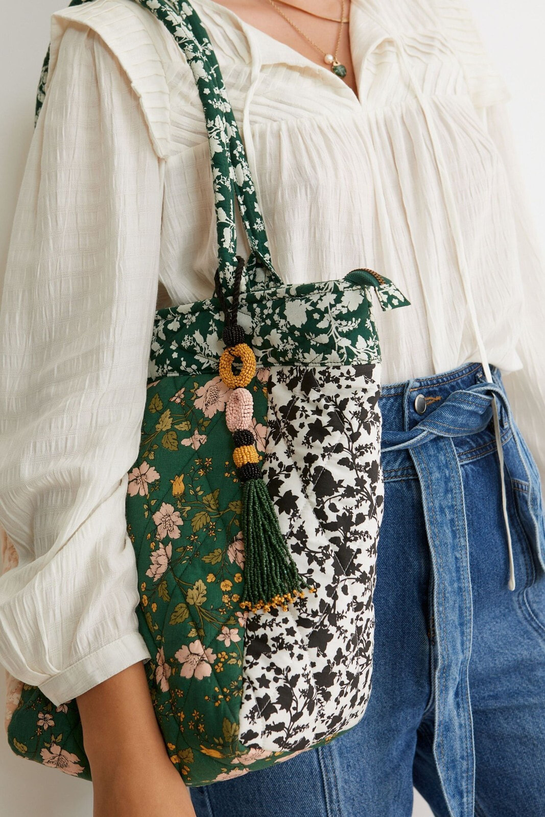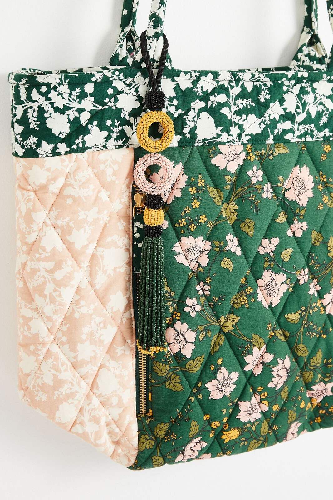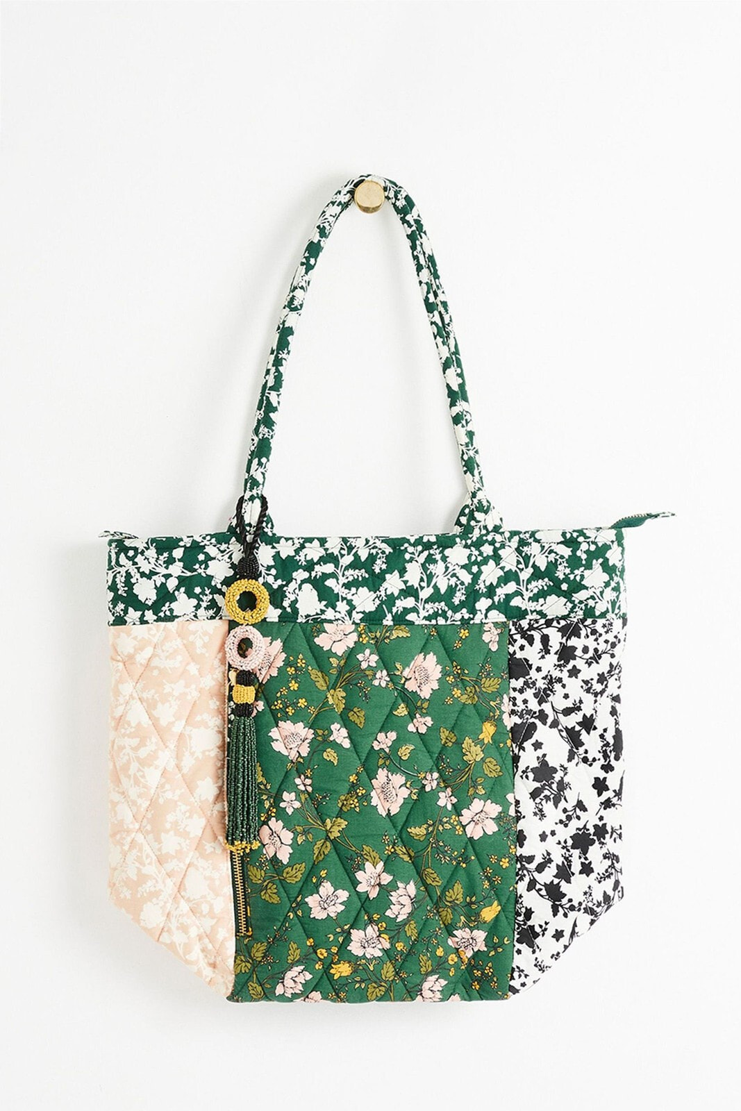 Bring a tactile touch to your accessories with this quilted tote bag. Featuring floral print paneling in green and pink tones, this boho-vibe bag has a beaded and tassel embellishment and a zipped main compartment.