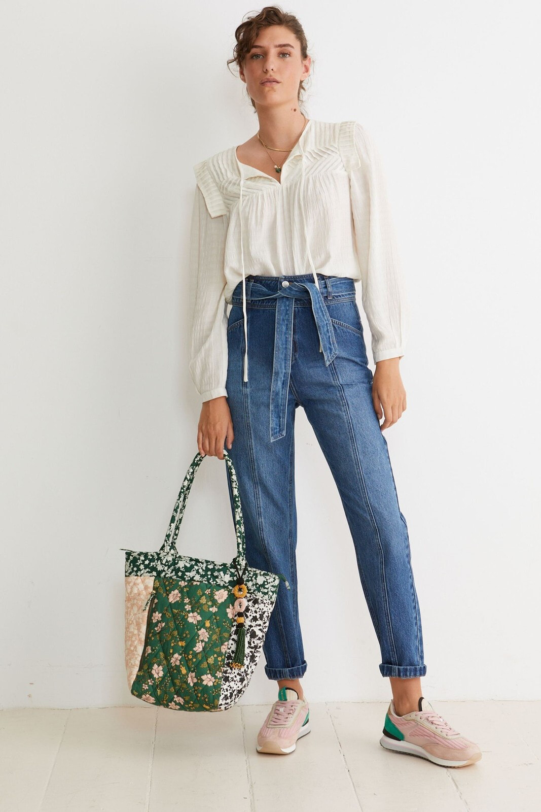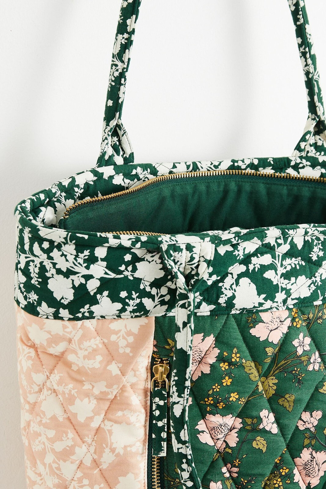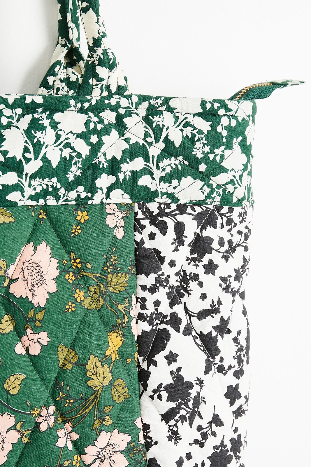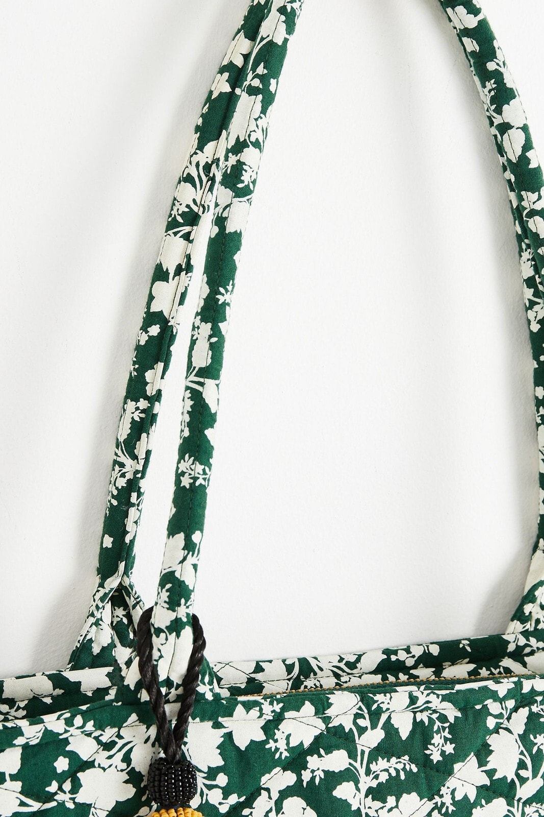 Bring a tactile touch to your accessories with this quilted tote bag. Featuring floral print paneling in green and pink tones, this boho-vibe bag has a beaded and tassel embellishment and a zipped main compartment.