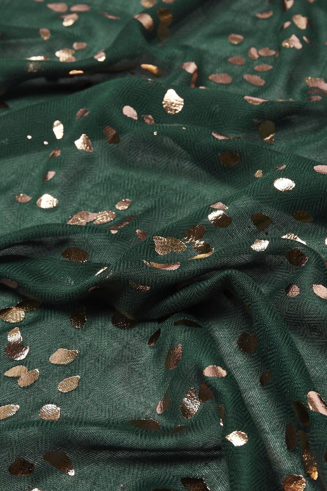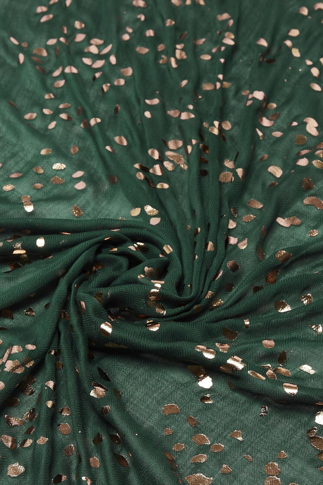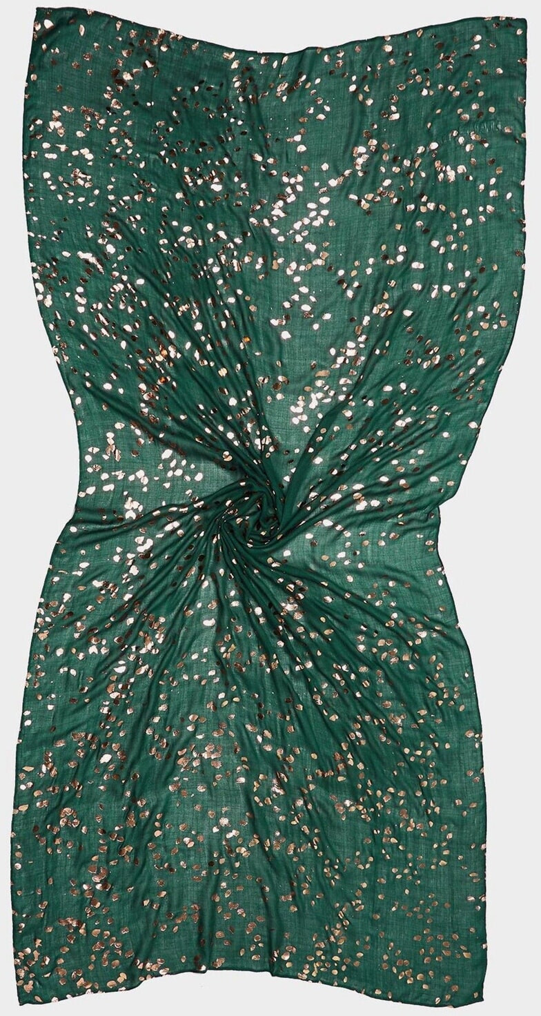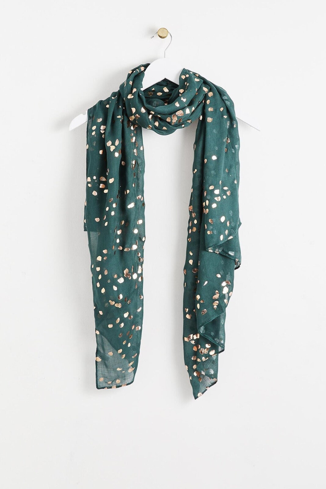 Adorned in golden foil spots, this green lightweight scarf can be added to your look to add a glimmering touch.