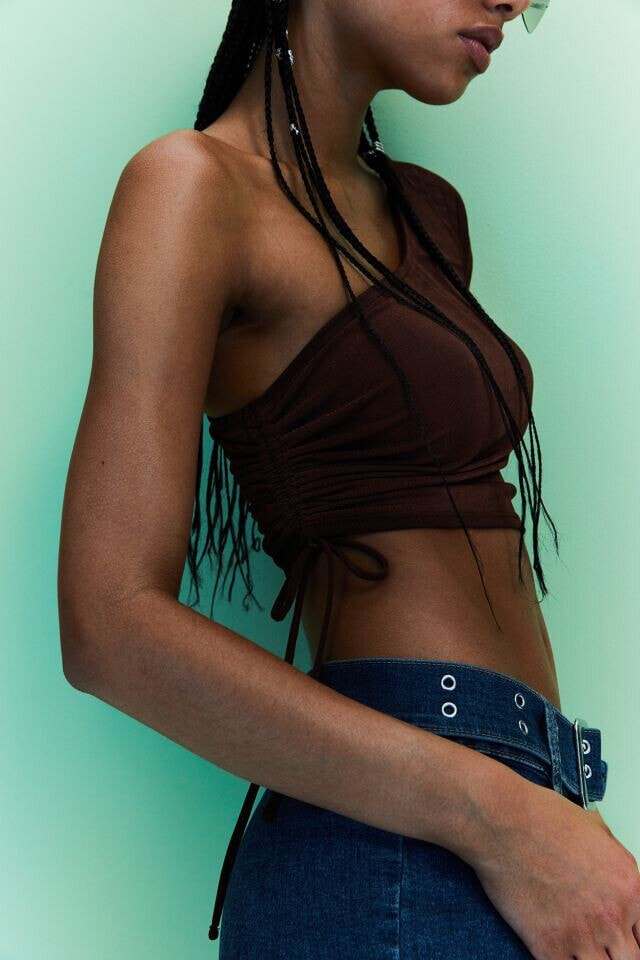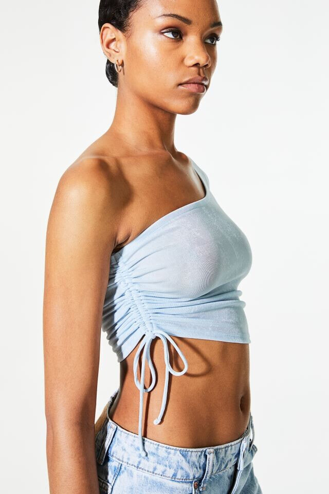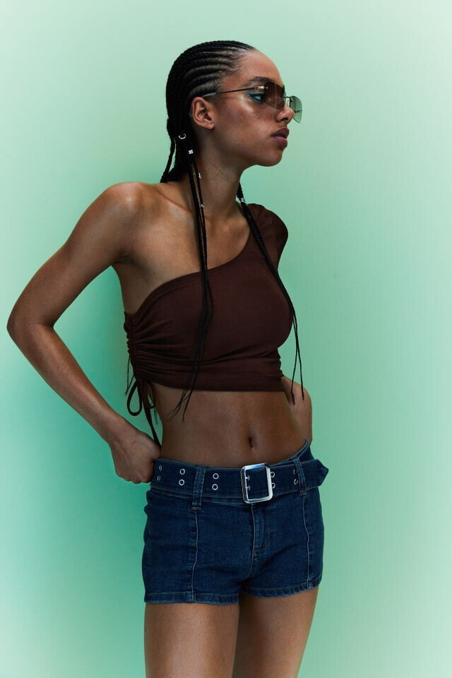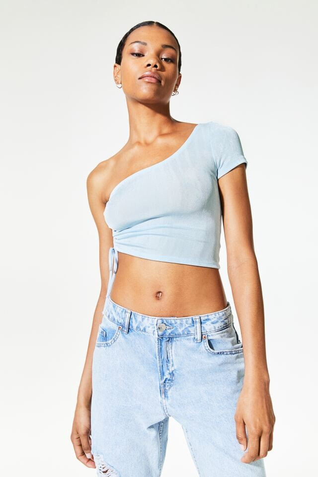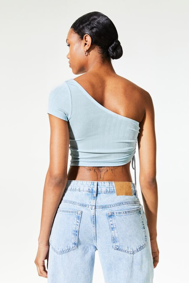 Short, fitted, one-shoulder top in ribbed stretch jersey with one short sleeve. Vertical drawstring at one side for a draped effect.