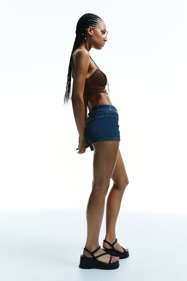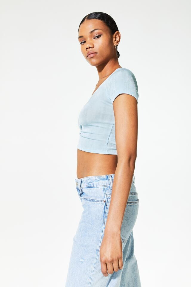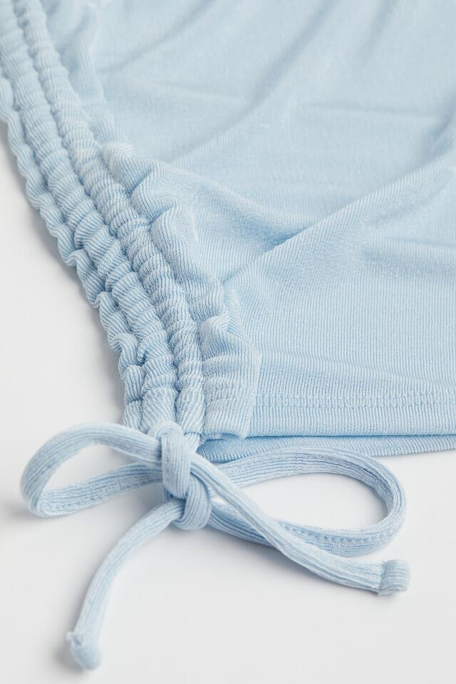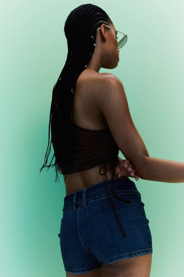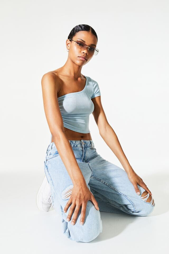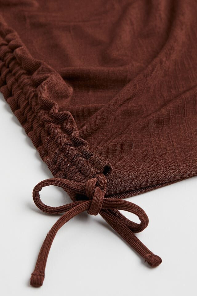 Short, fitted, one-shoulder top in ribbed stretch jersey with one short sleeve. Vertical drawstring at one side for a draped effect.