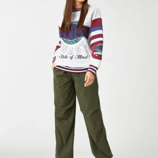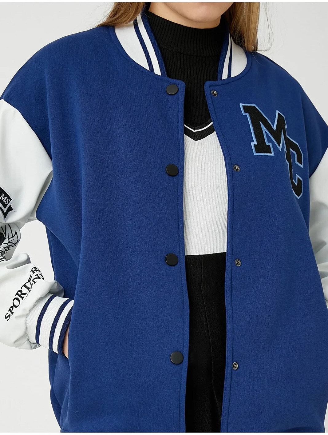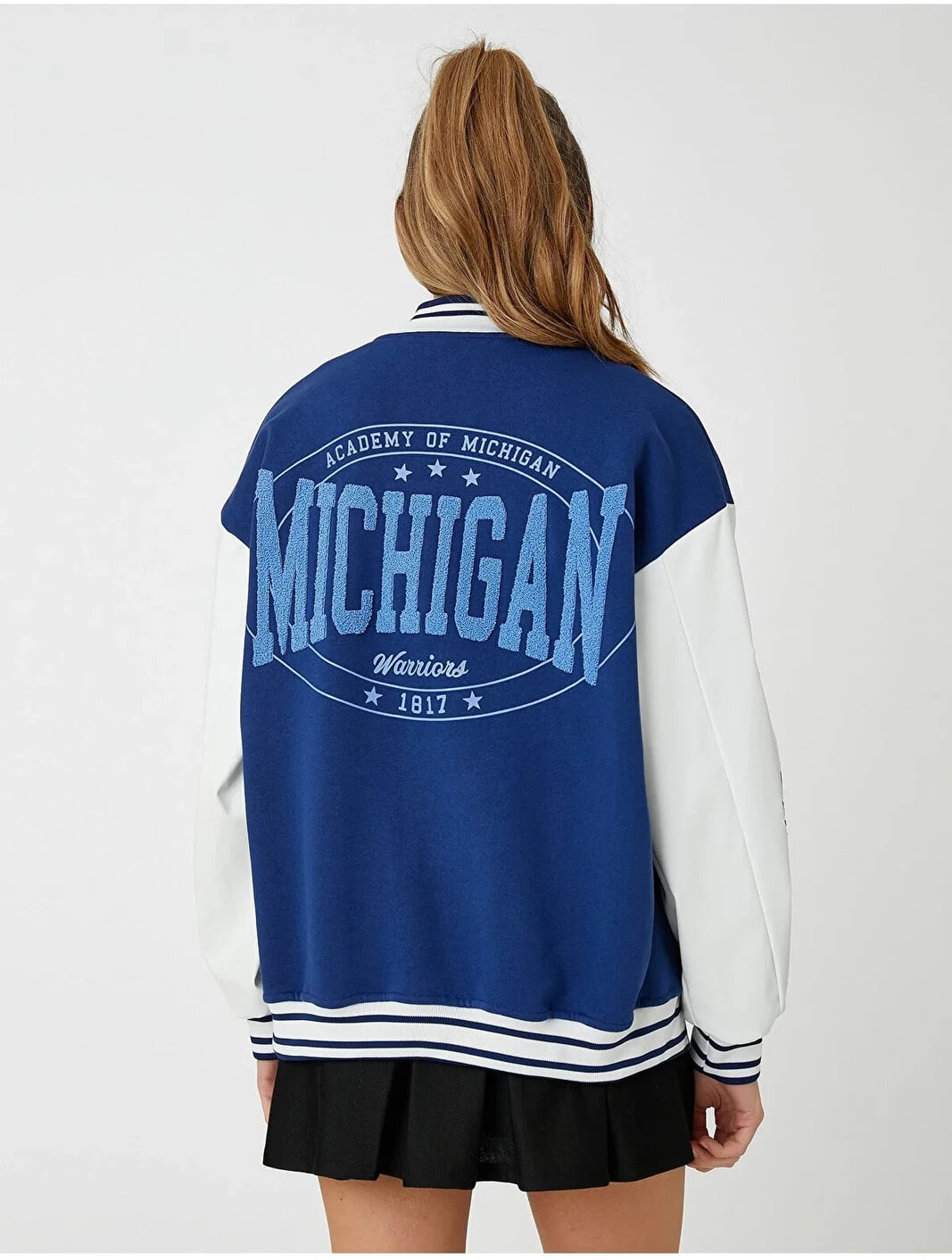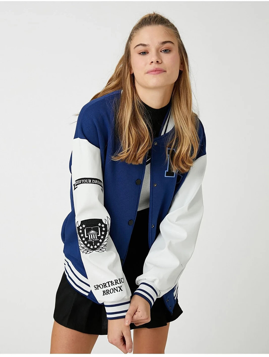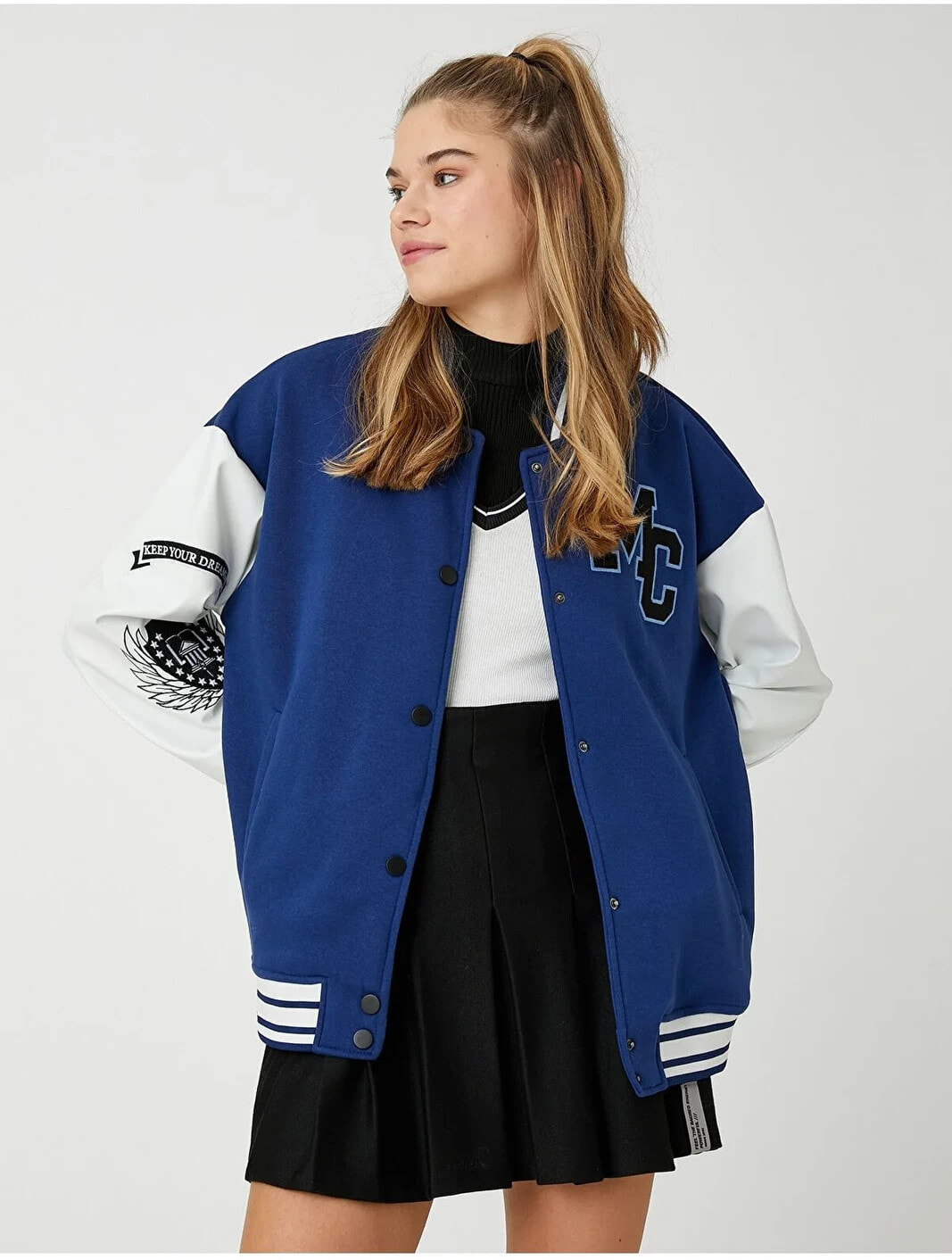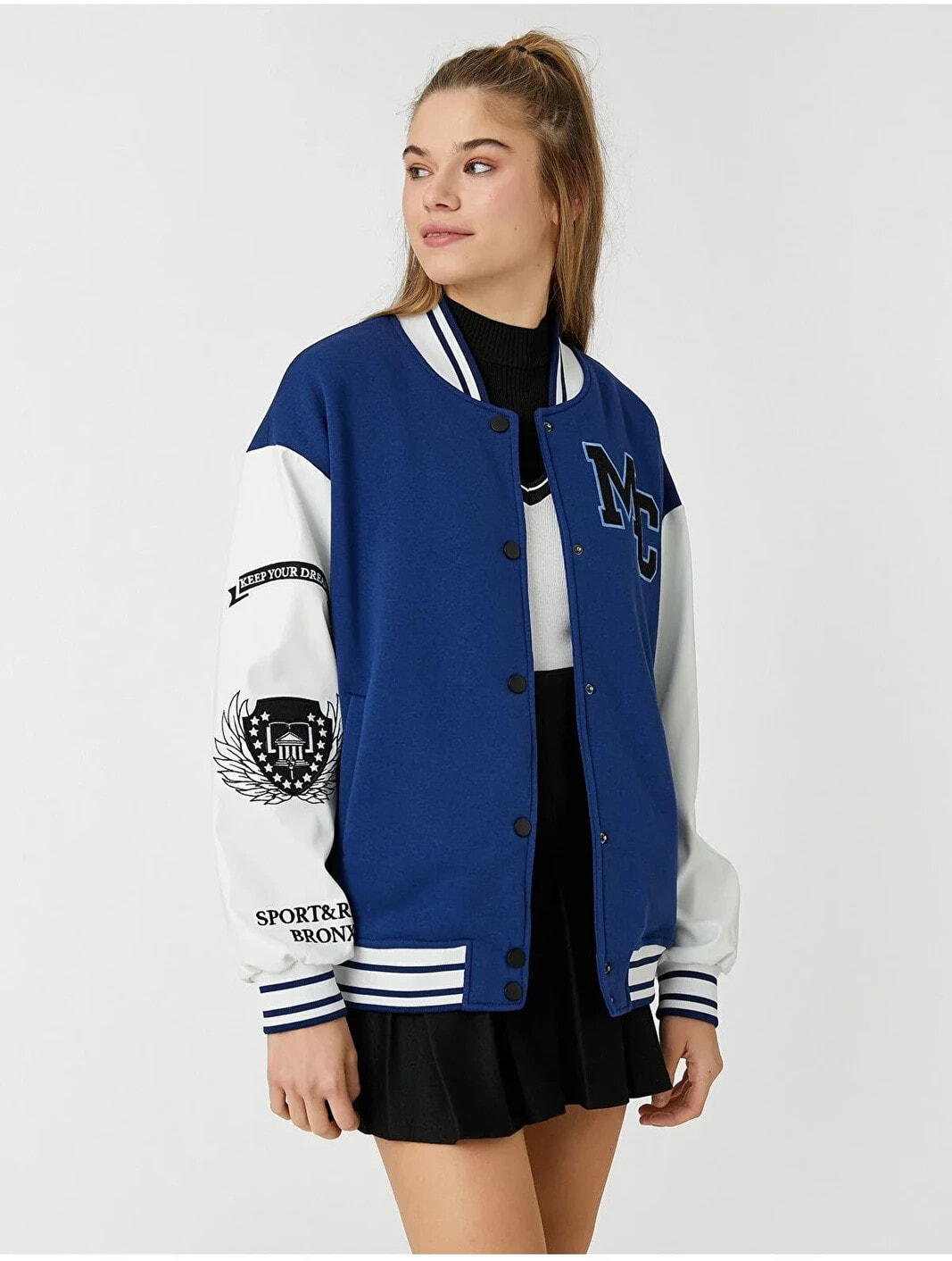 Baskılı, işlemeli, ribanalı, çıtçıt kapama, oversize kolej ceket.