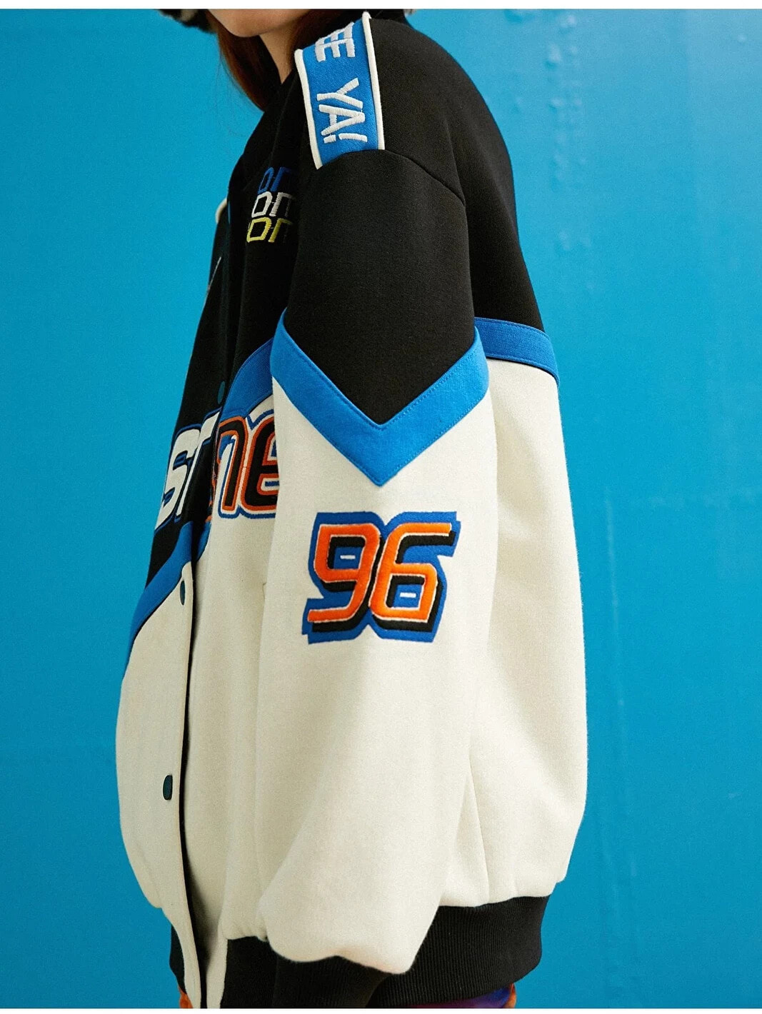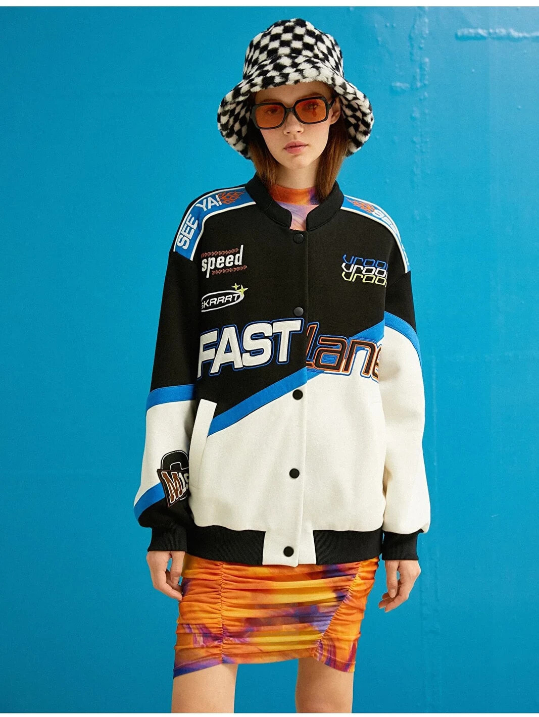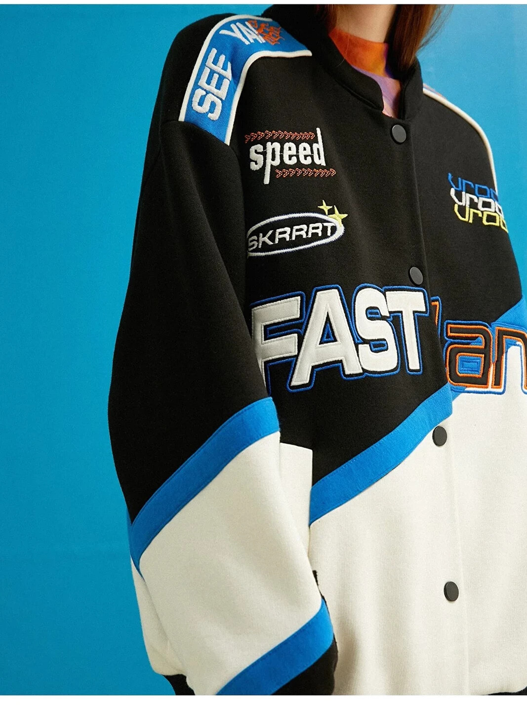 Baskılı, oversize, ribanalı kolej ceket.