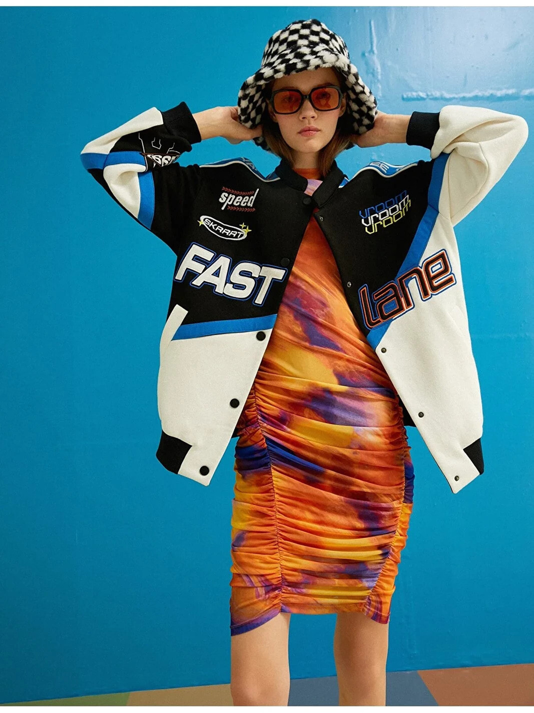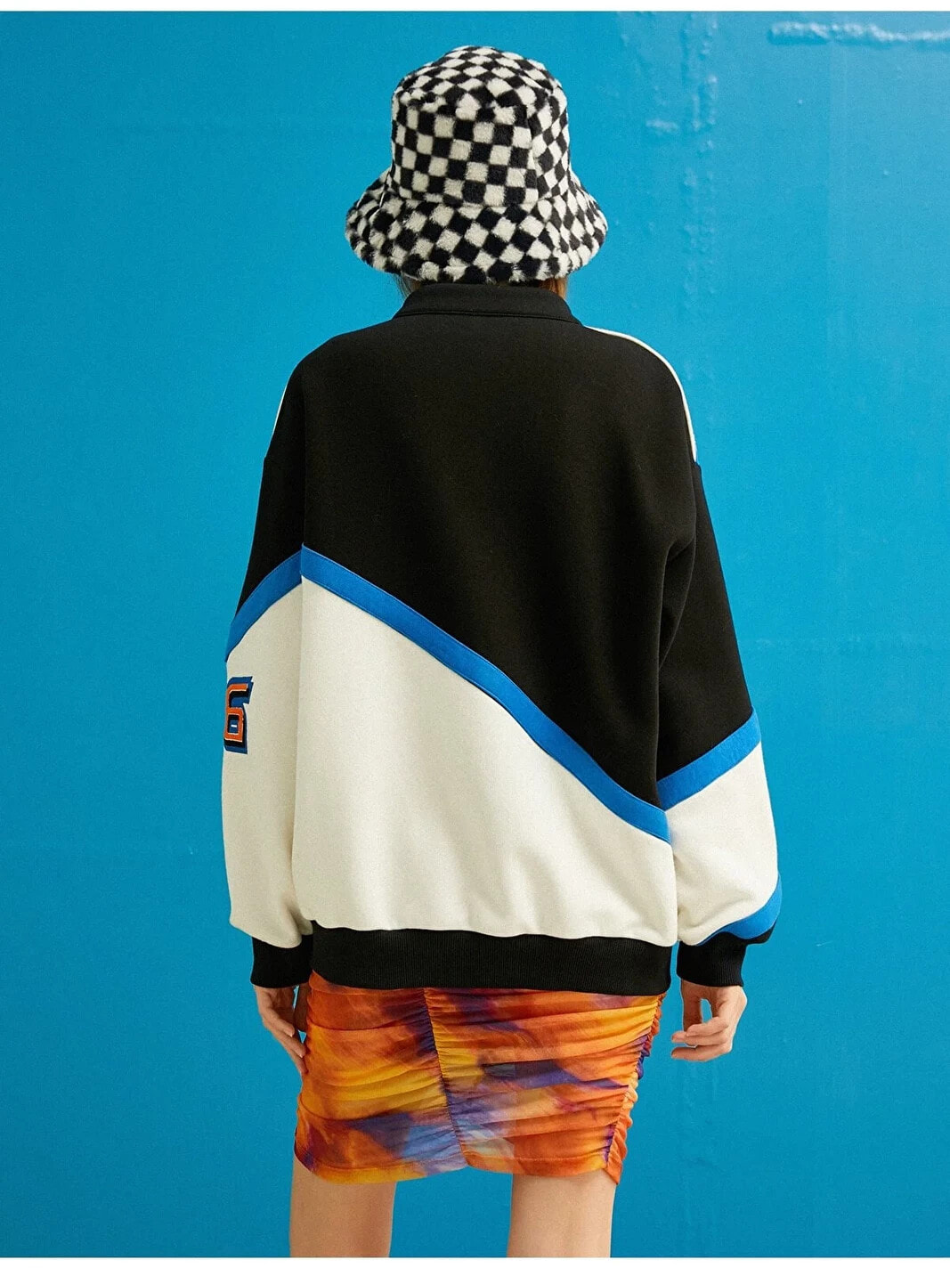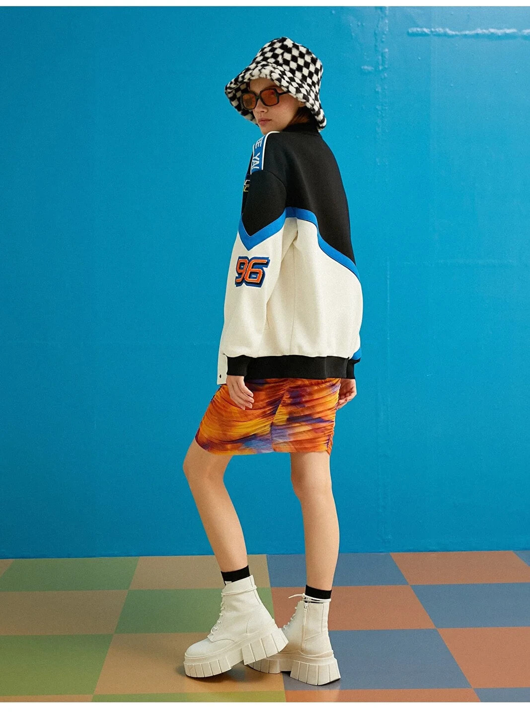 Baskılı, oversize, ribanalı kolej ceket.