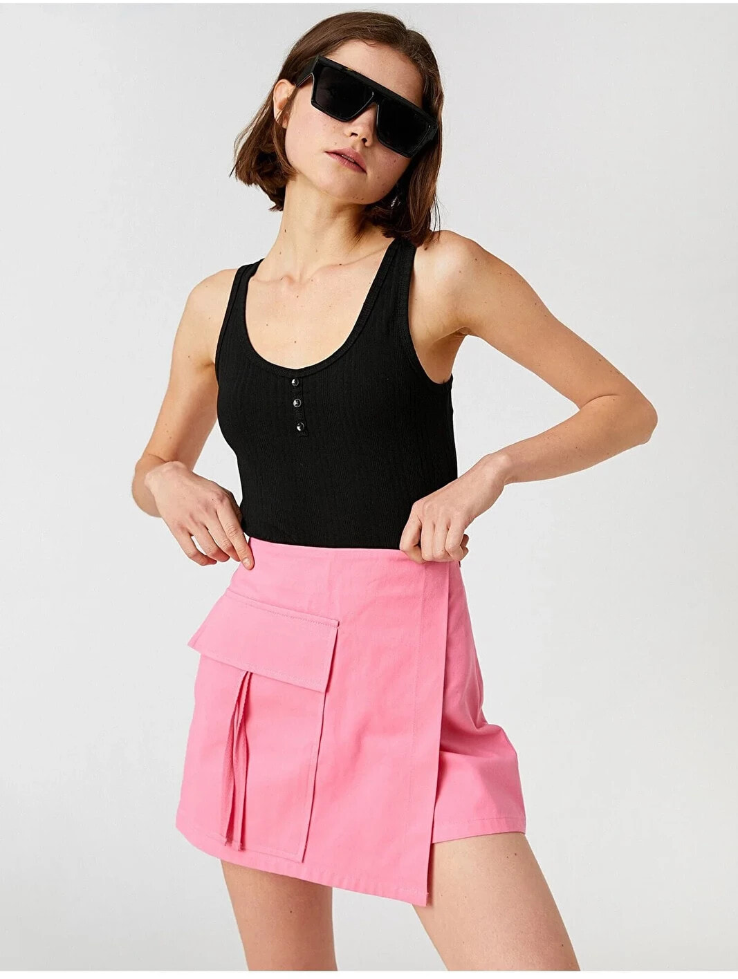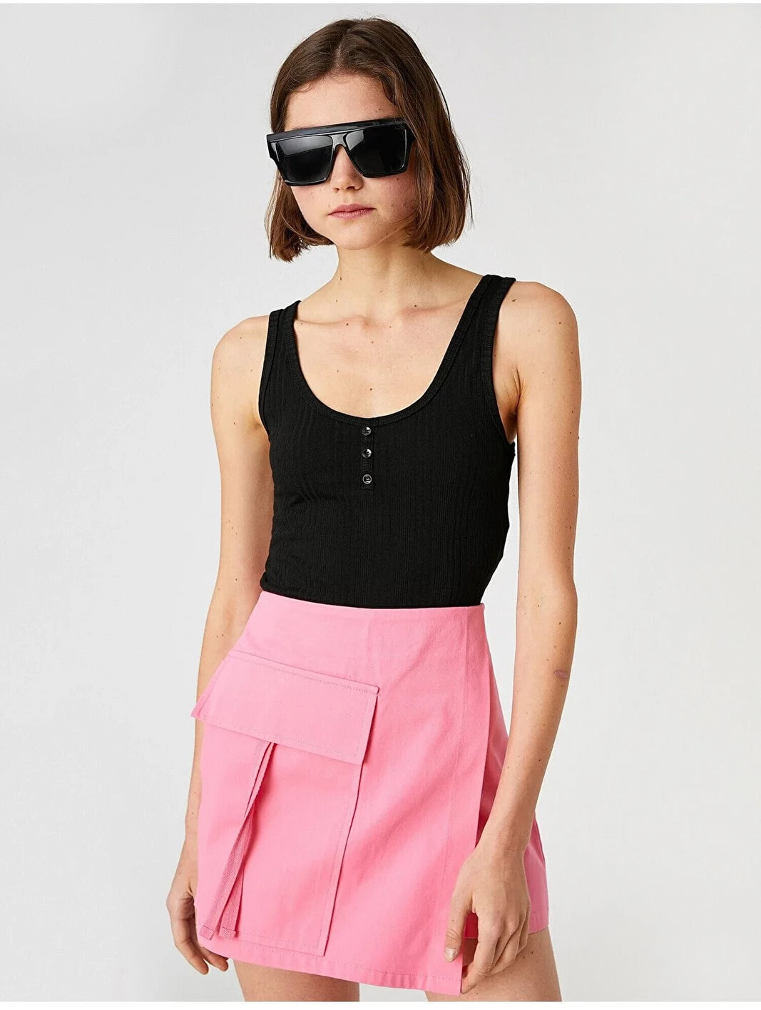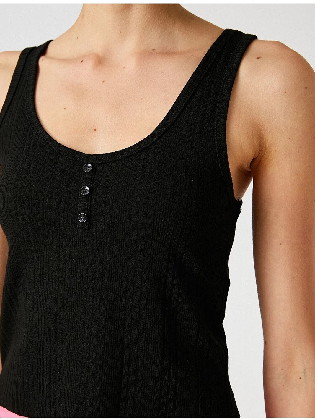 Düğme detaylı, oyuk yaka atlet. Model Bilgileri: Boy:175 cm, Göğüs:76, Bel:58, Kalça:1, Modelin Bedeni:S