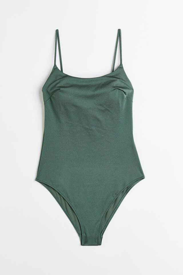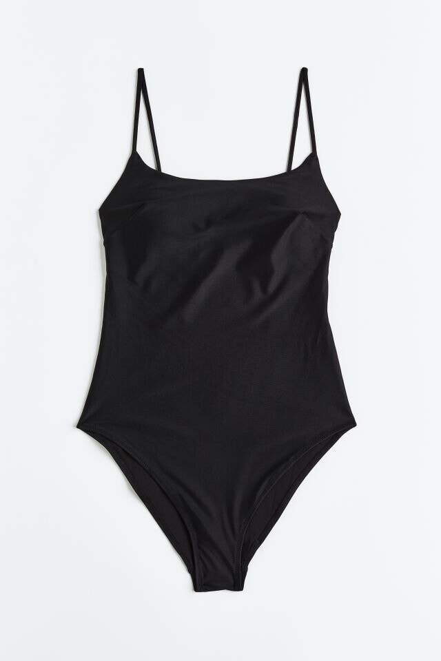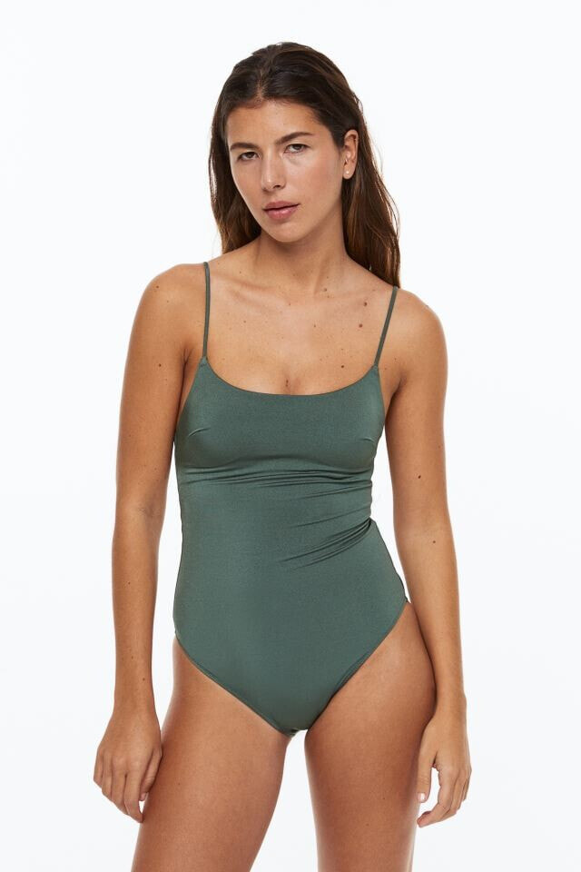 Lined swimsuit. Narrow, adjustable shoulder straps, round neckline, and lightly padded cups with removable inserts for shaping and good support. Medium coverage at back.