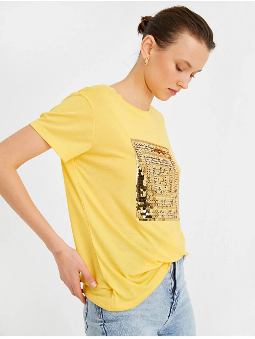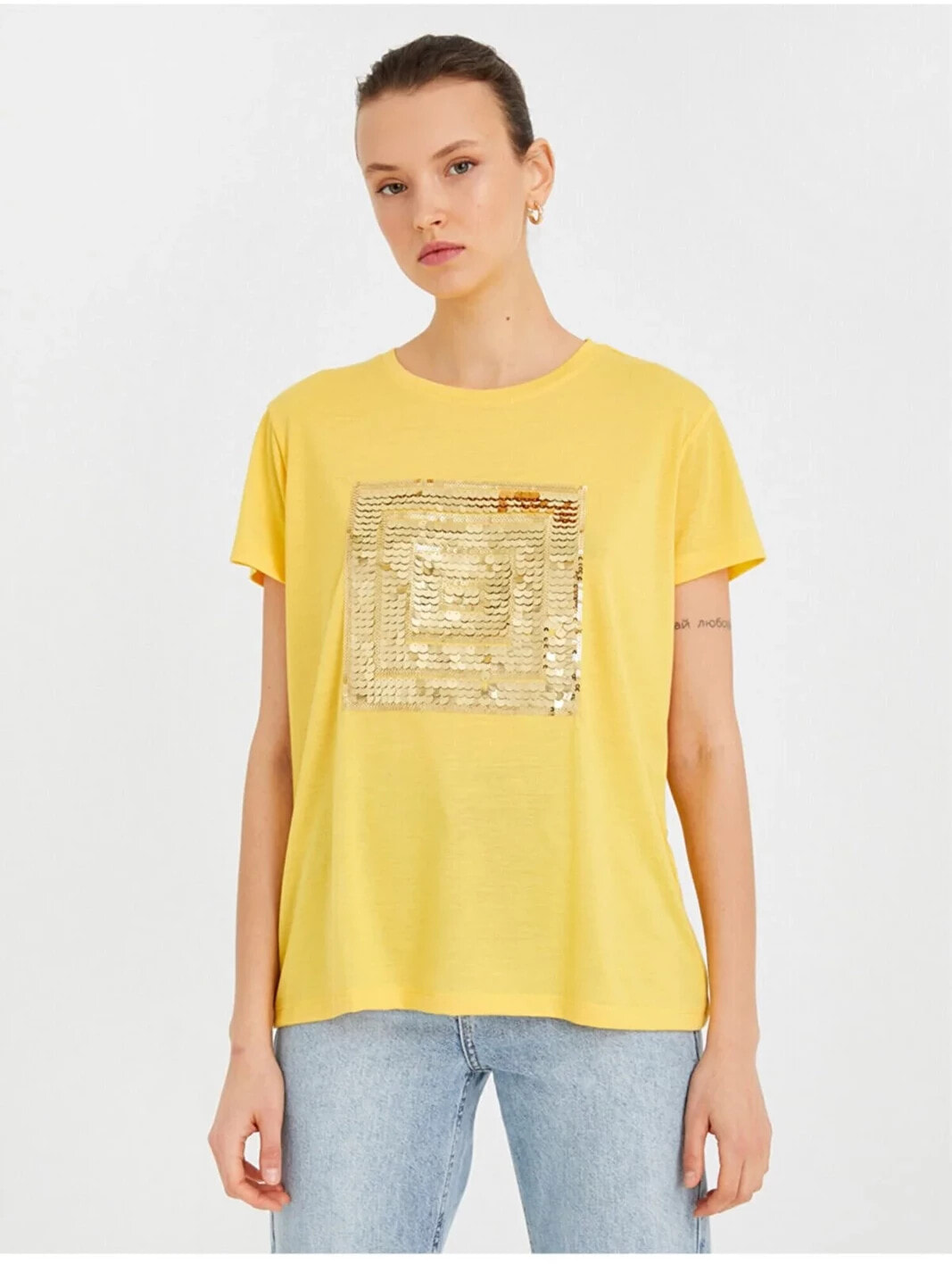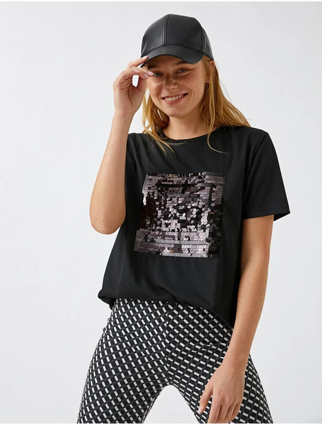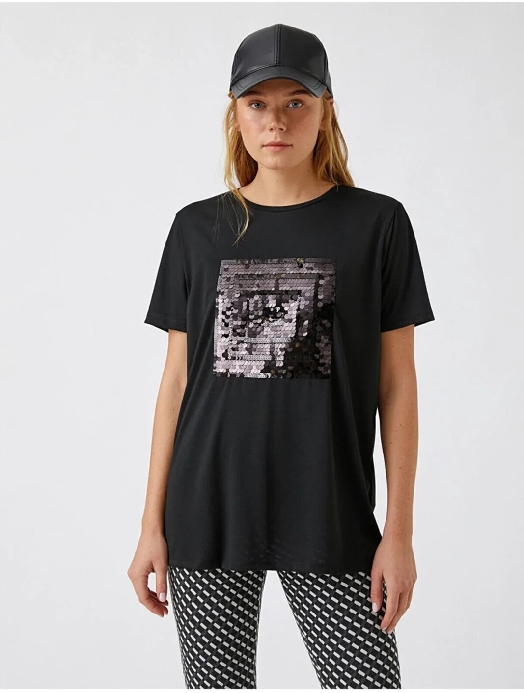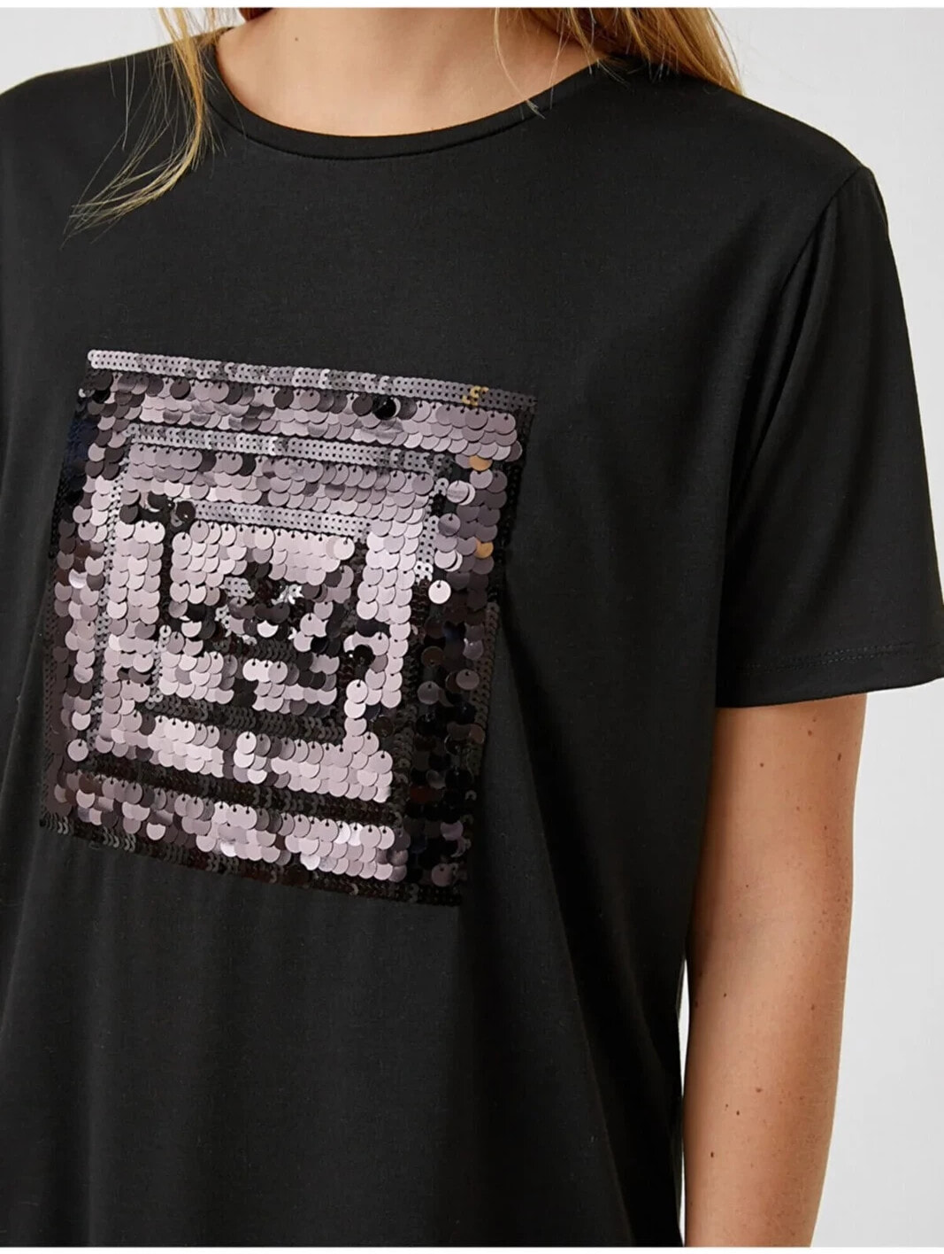 Payetli Kısa Kollu Tişört Model Bilgileri: Boy:175 cm, Göğüs:81, Bel:60, Kalça:88, Modelin Bedeni:S
