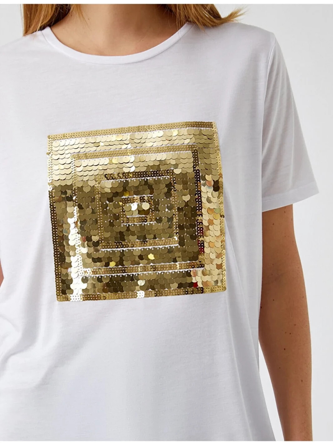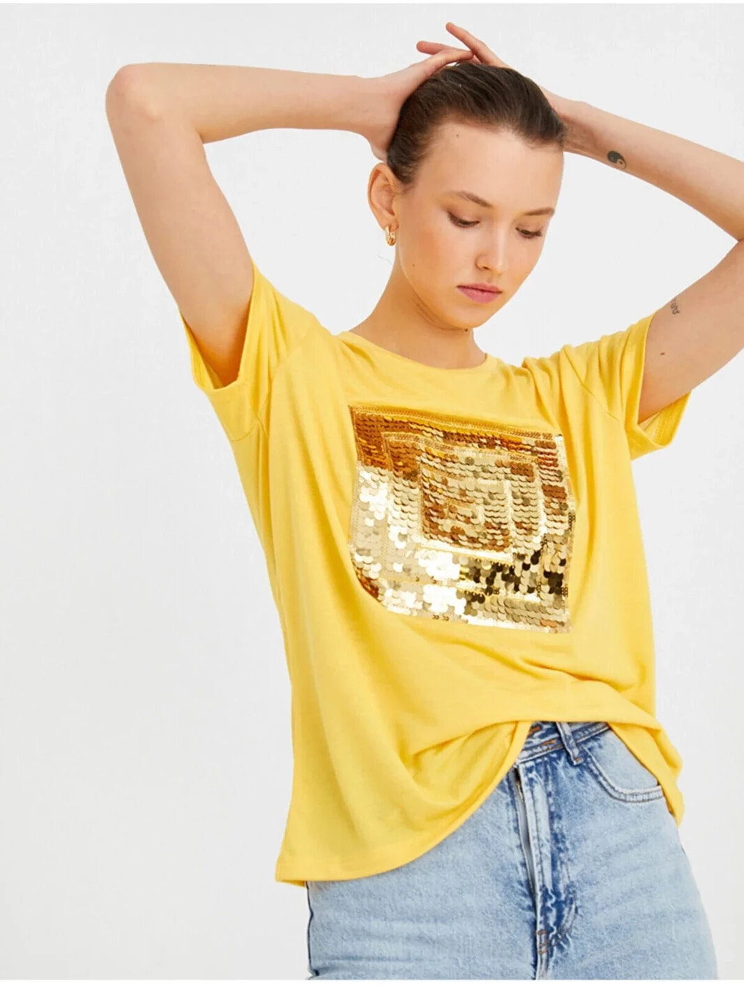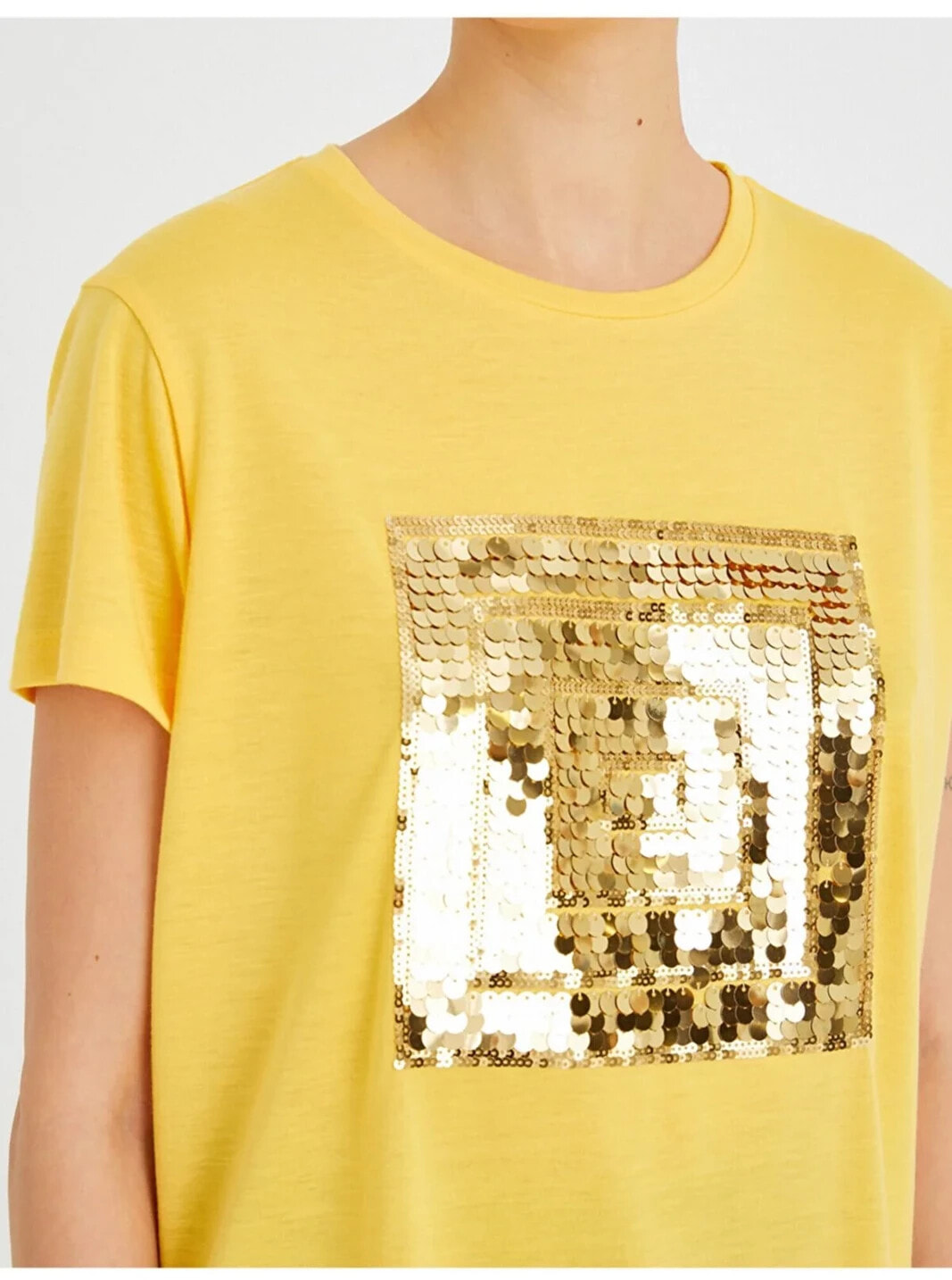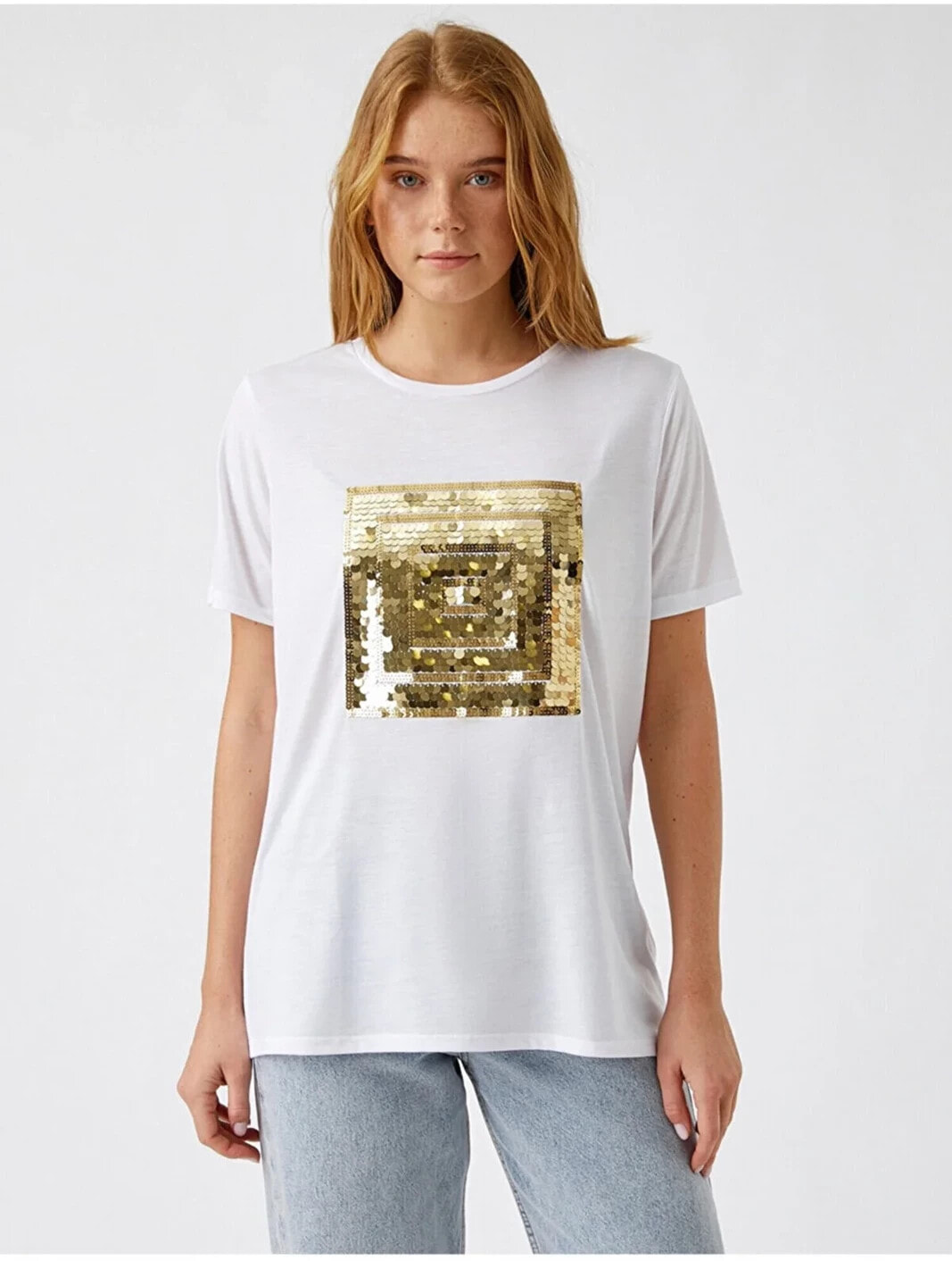 Payetli Kısa Kollu Tişört Model Bilgileri: Boy:175 cm, Göğüs:81, Bel:60, Kalça:88, Modelin Bedeni:S