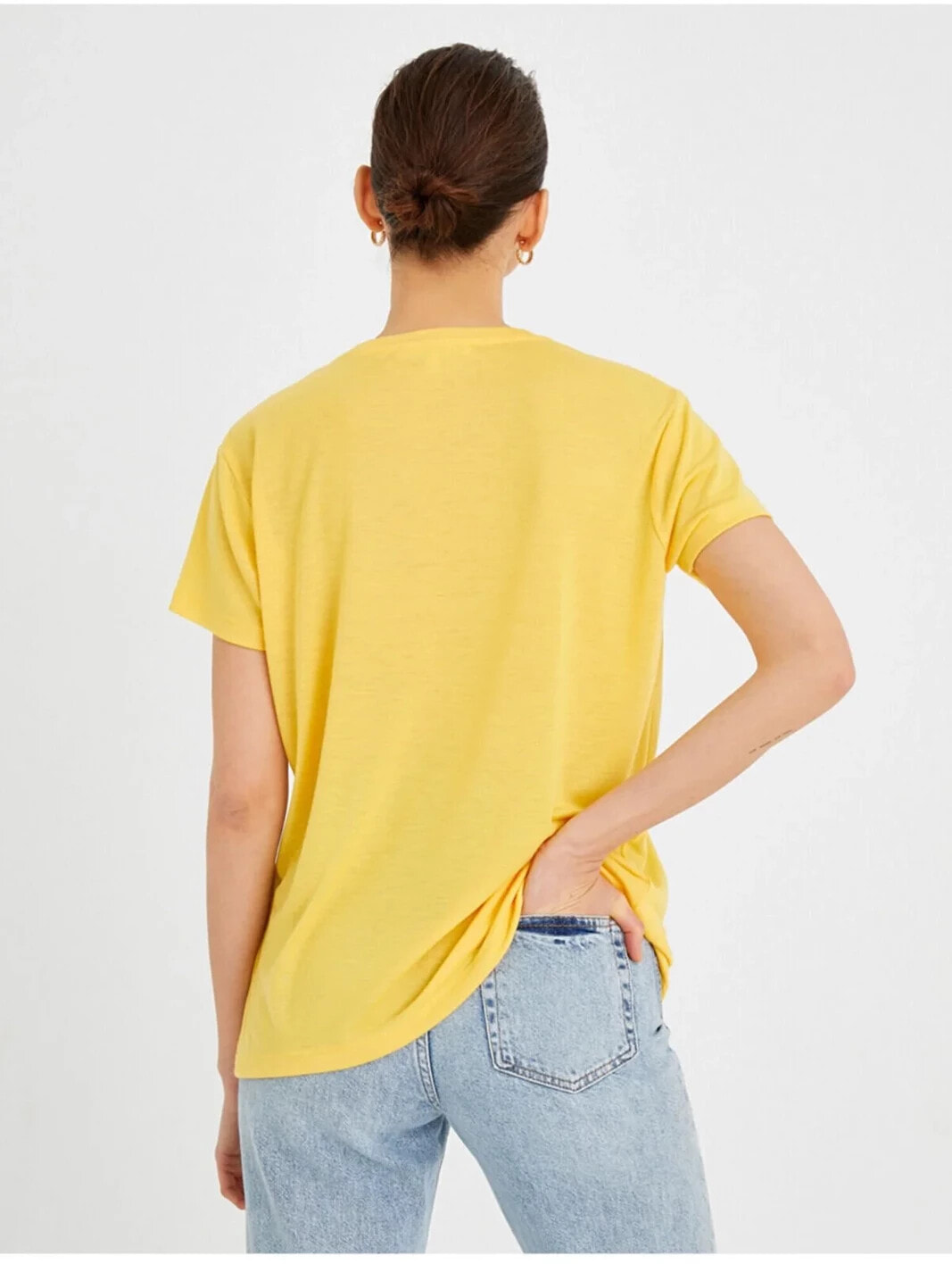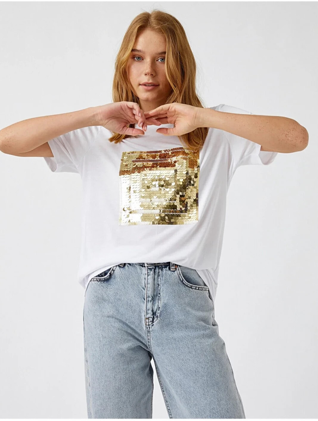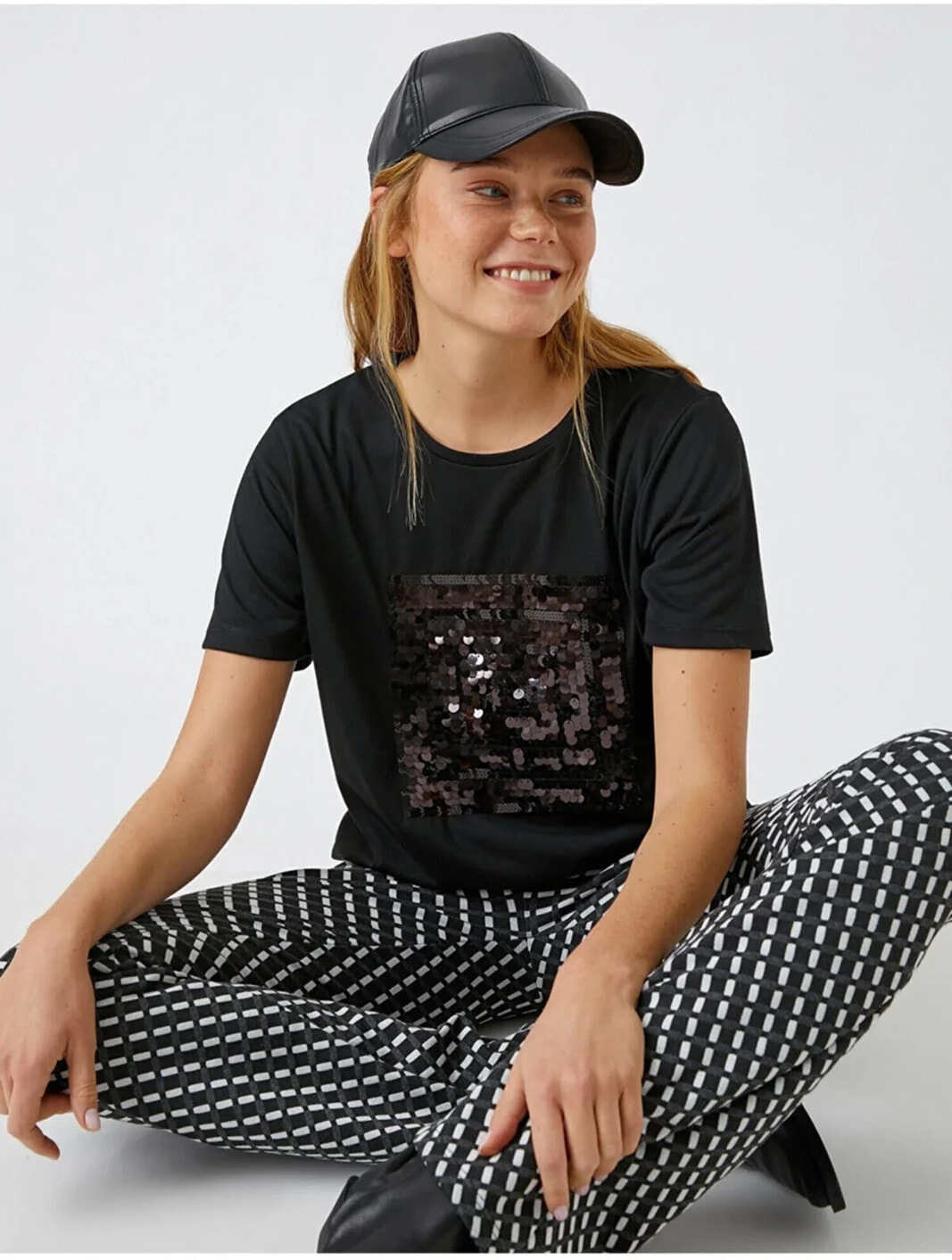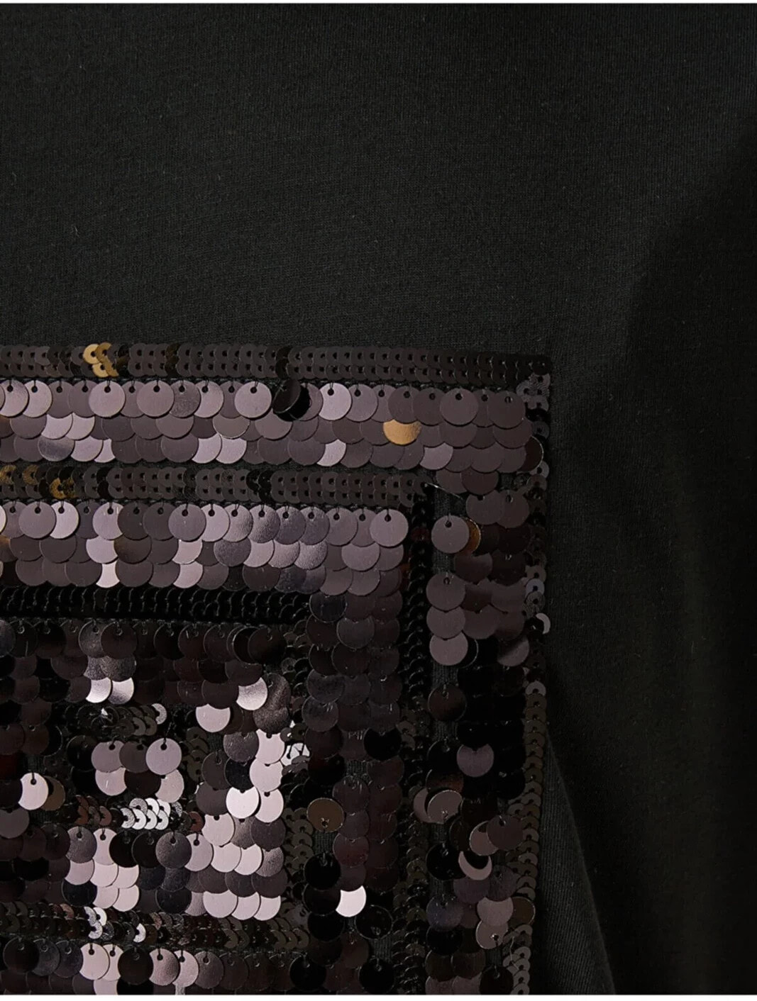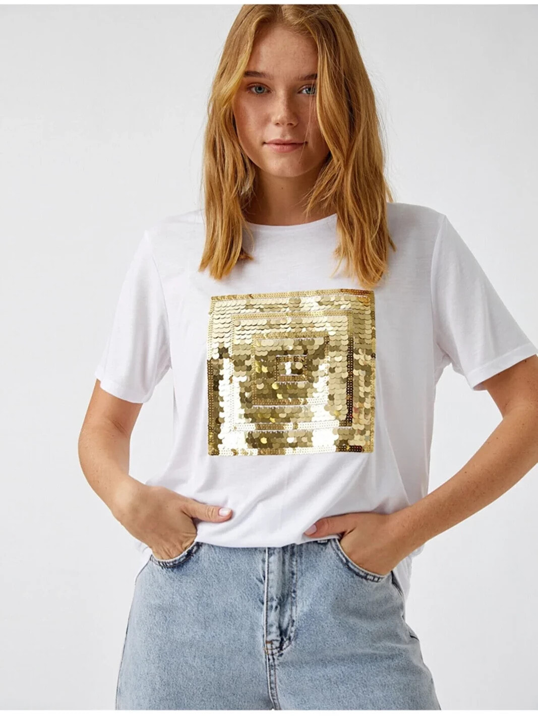 Payetli Kısa Kollu Tişört Model Bilgileri: Boy:175 cm, Göğüs:81, Bel:60, Kalça:88, Modelin Bedeni:S