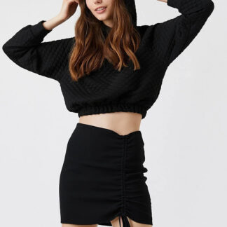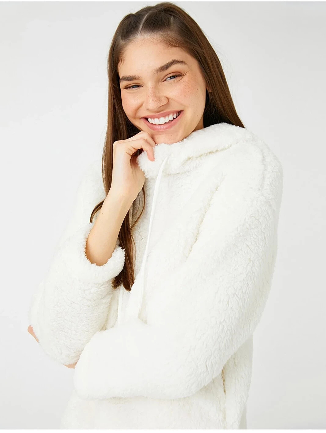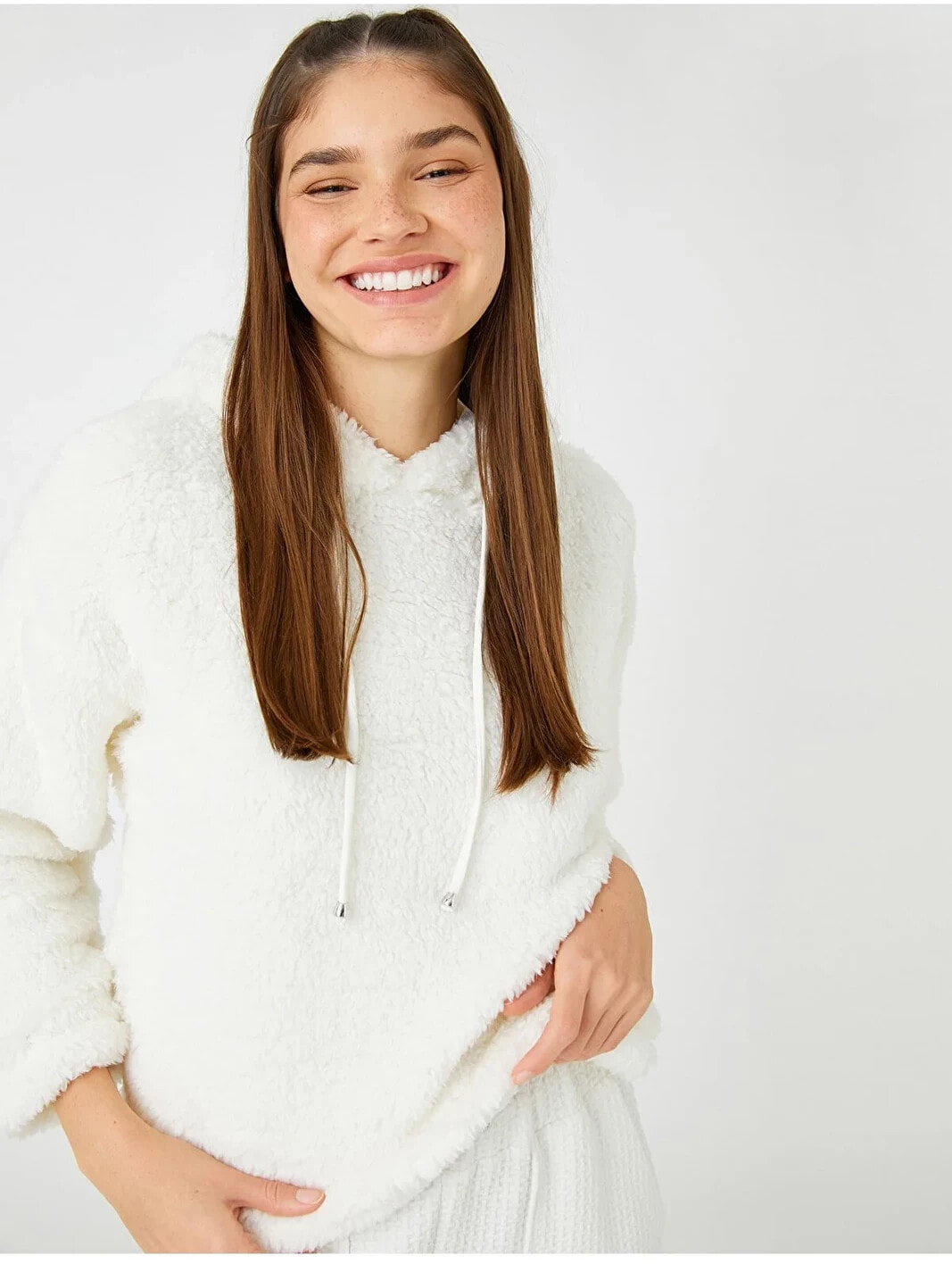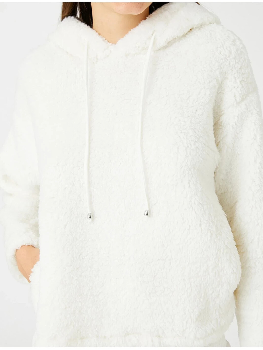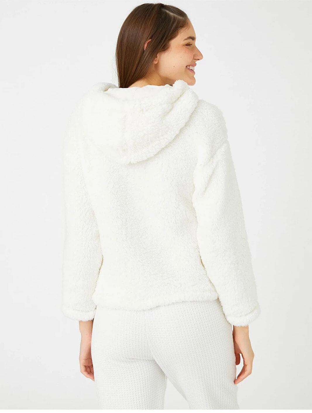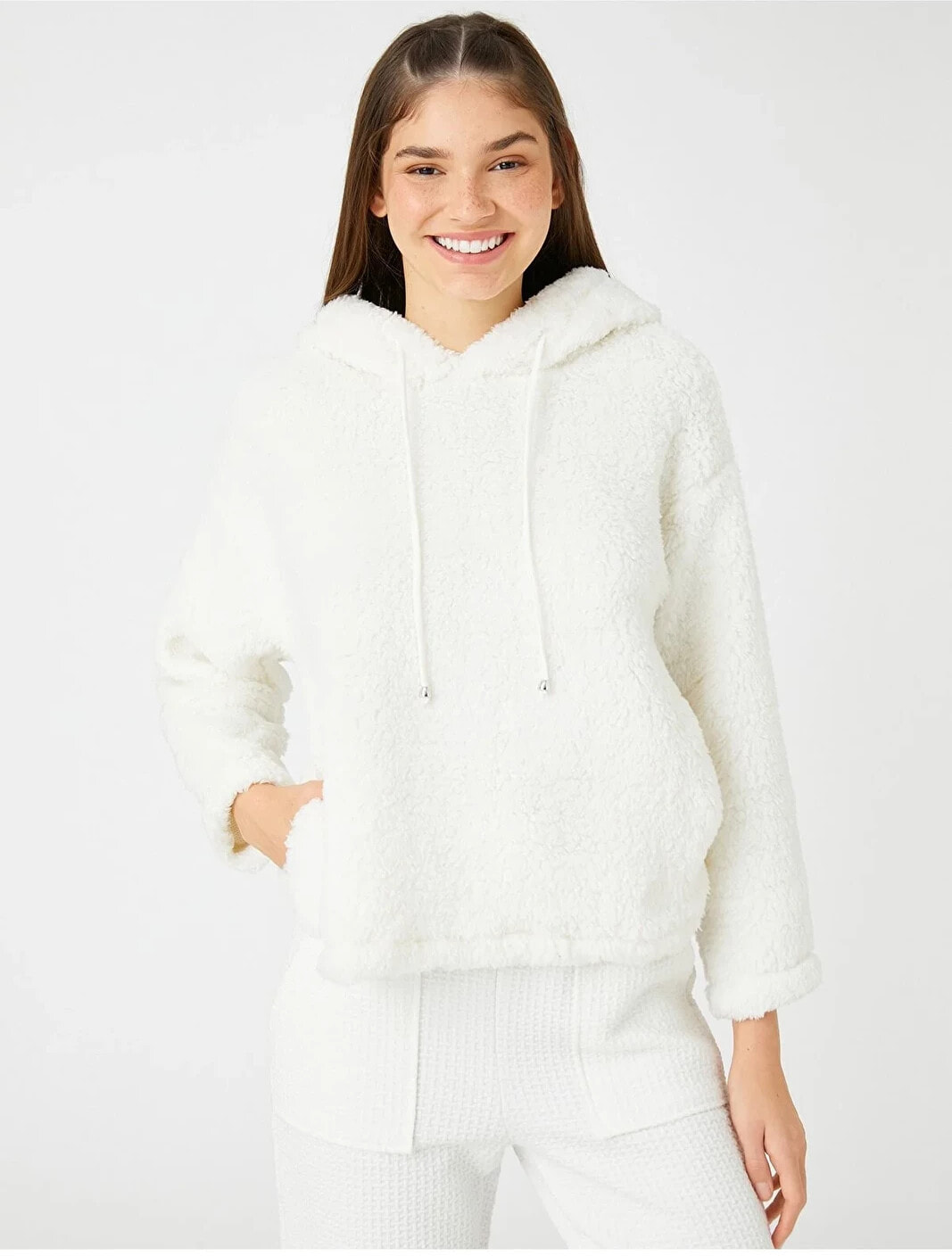 Cep detaylı, kapüşonlu, peluş sweatshirt pijama üstü.
