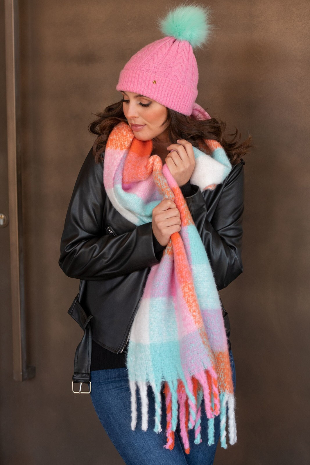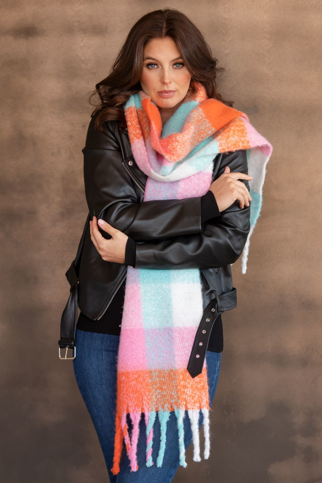 Wrap up in style in the Check Tassel Scarf. In a beautiful check print and super soft brushed knit fabric, this oversized scarf will elevate your winter outfits. Feel warm and look fabulous in this soft scarf with tassle fringing.