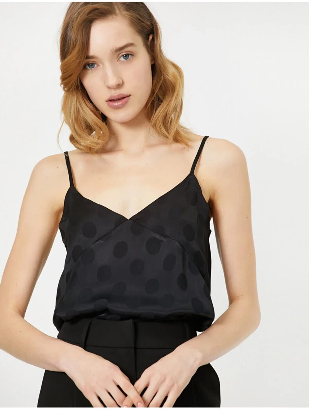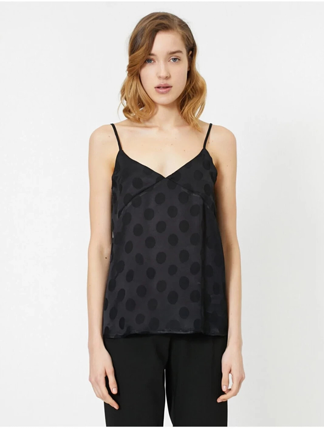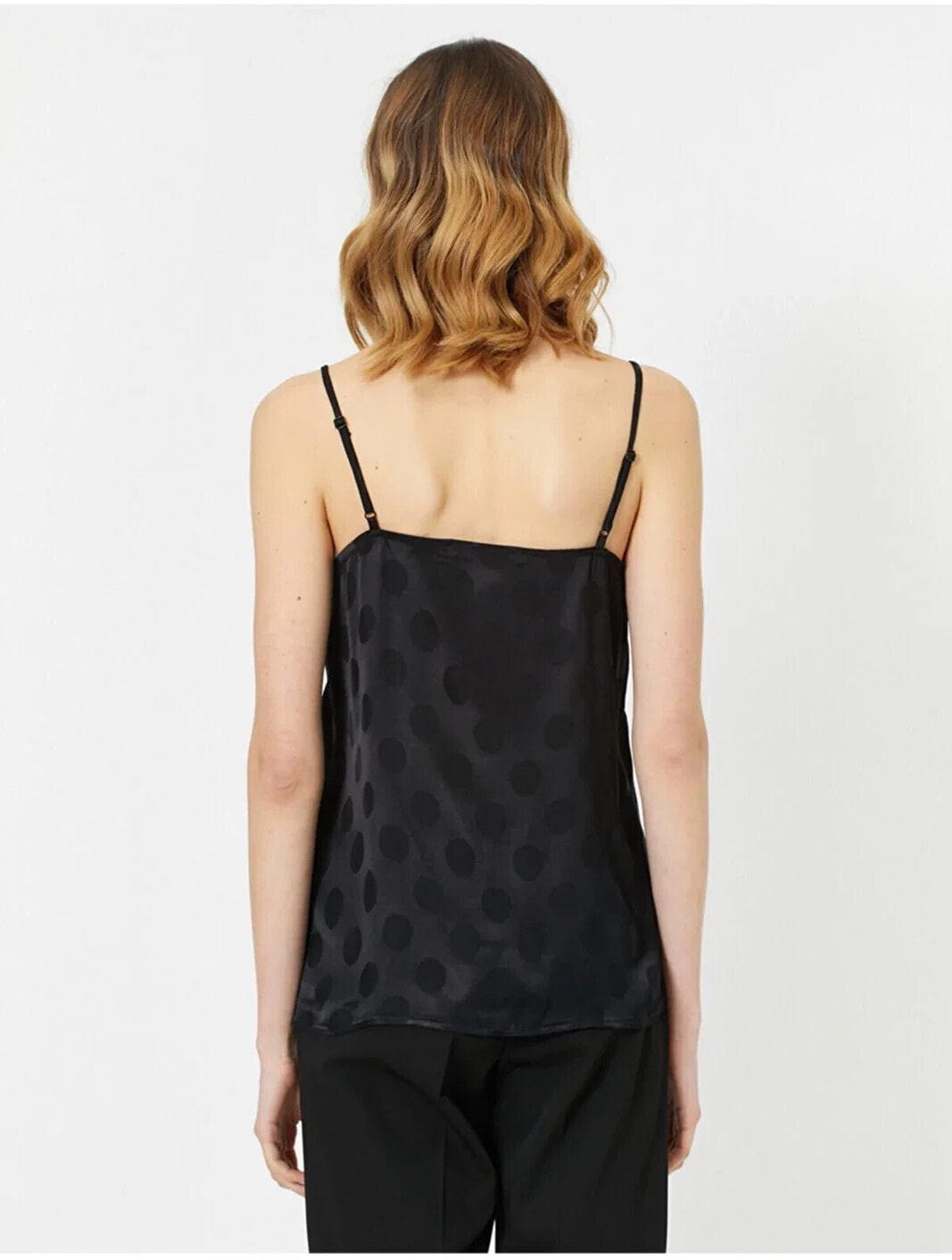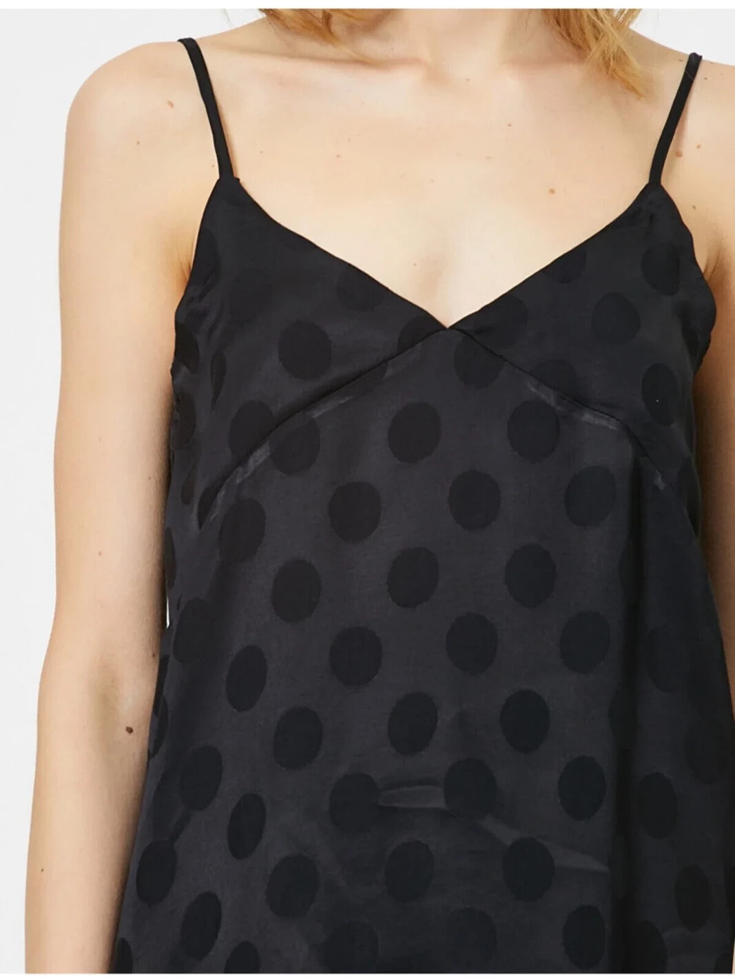 Puantiye Desenli, Saten İp Askılı, Kolsuz Atlet Model Bilgileri: Boy:175 cm, G??????s:80, Bel:59, Kal??a:88, Modelin Bedeni:S