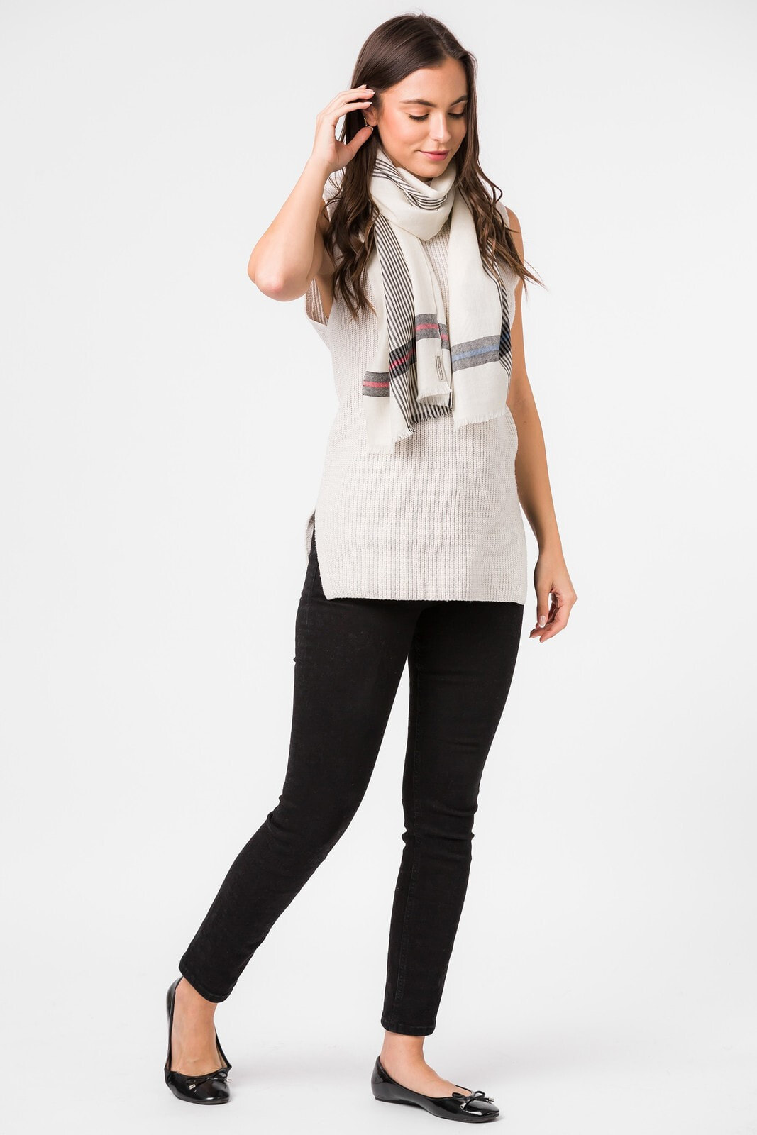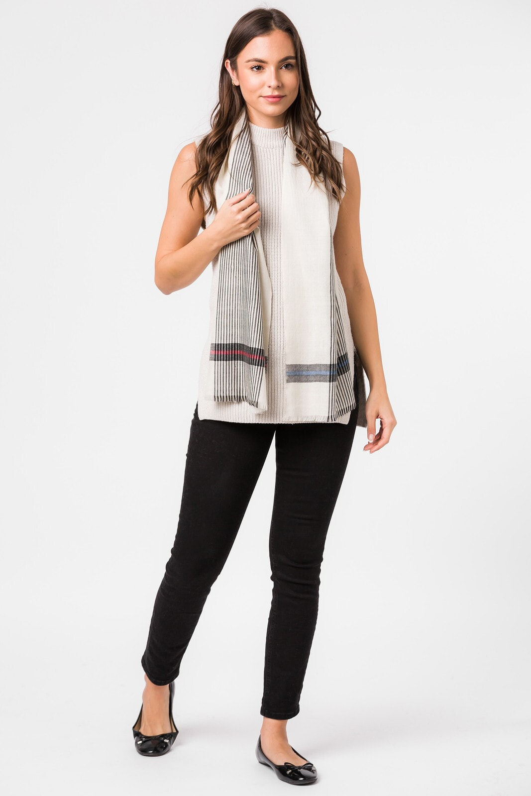 The ‘Pixel’ scarf from Pure Luxuries London is woven from 50% cashmere and 50% merino wool blend for a soft yet durable feel. A classic black and white striped design elevated by stripes of blue and red. Perfect all year round for whenever the cold weather hits. An intricate knitted design gives this scarf a unique look. Pair with our other matching cashmere accessories. Presented in a 100% cotton Pure Luxuries branded pouch, ideal for gifting.