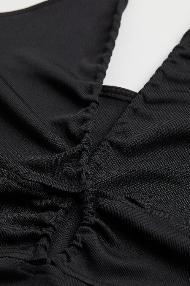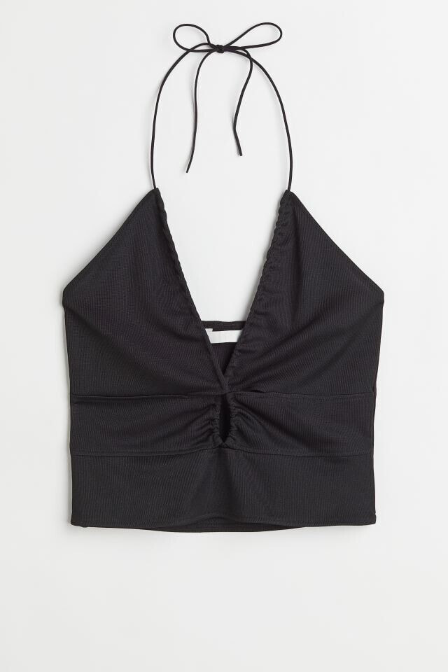 Fitted, halterneck crop top in ribbed jersey. Extra-narrow shoulder straps to tie at back of neck, V-neck at front with drawstring effect, and a cut-out section at front.