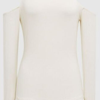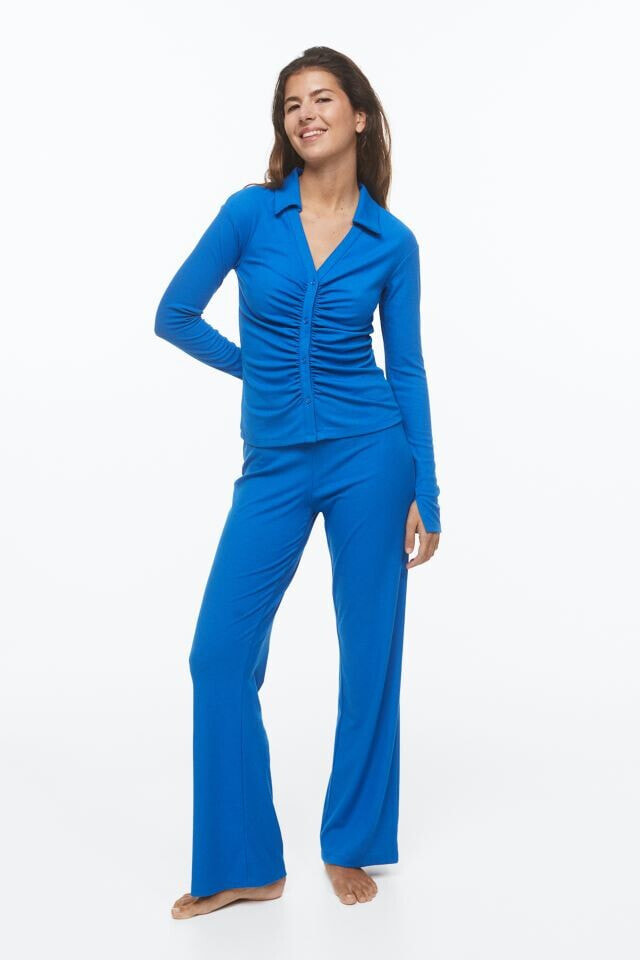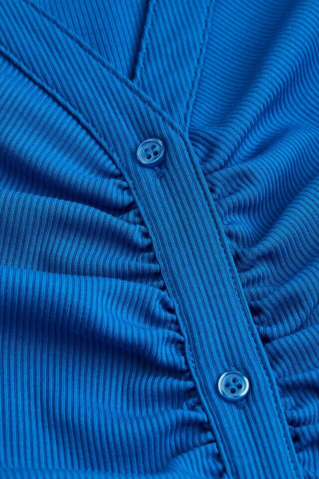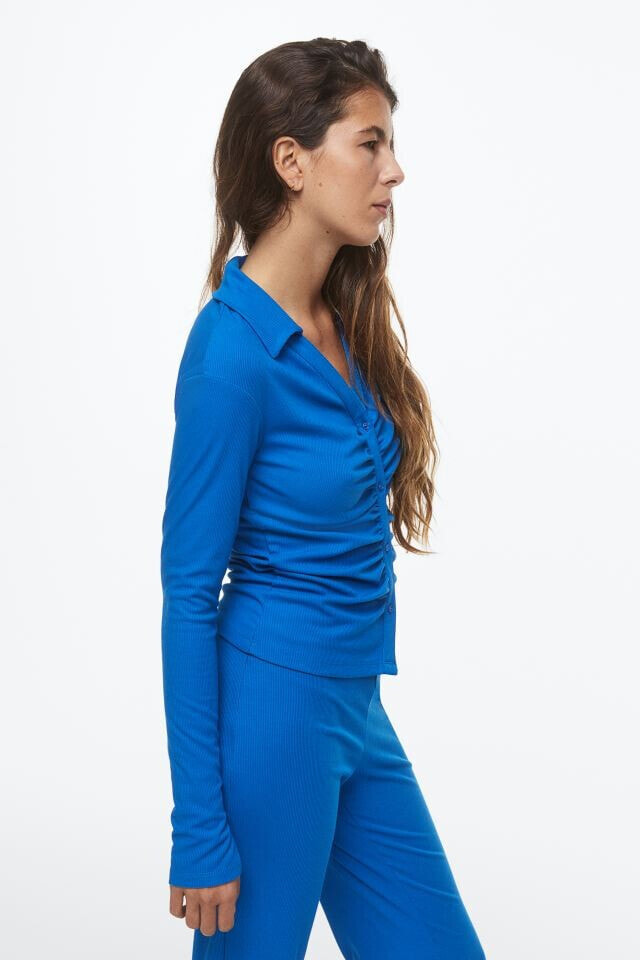 Long-sleeved top in soft, ribbed jersey with modal content. Collar, low-cut, V-shaped opening at front, and buttons at front with gathered seams along button placket. Straight-cut hem.