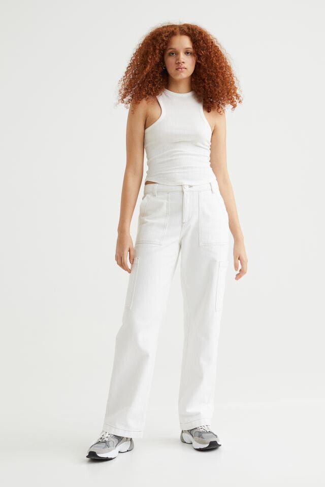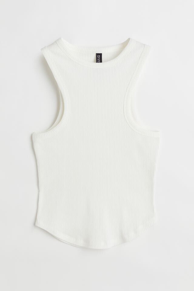 Fitted tank top in ribbed cotton jersey with trim at neckline and armholes. Rounded hem.