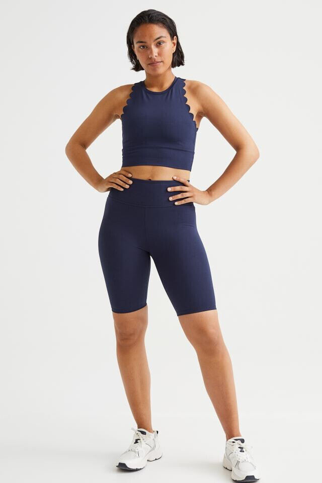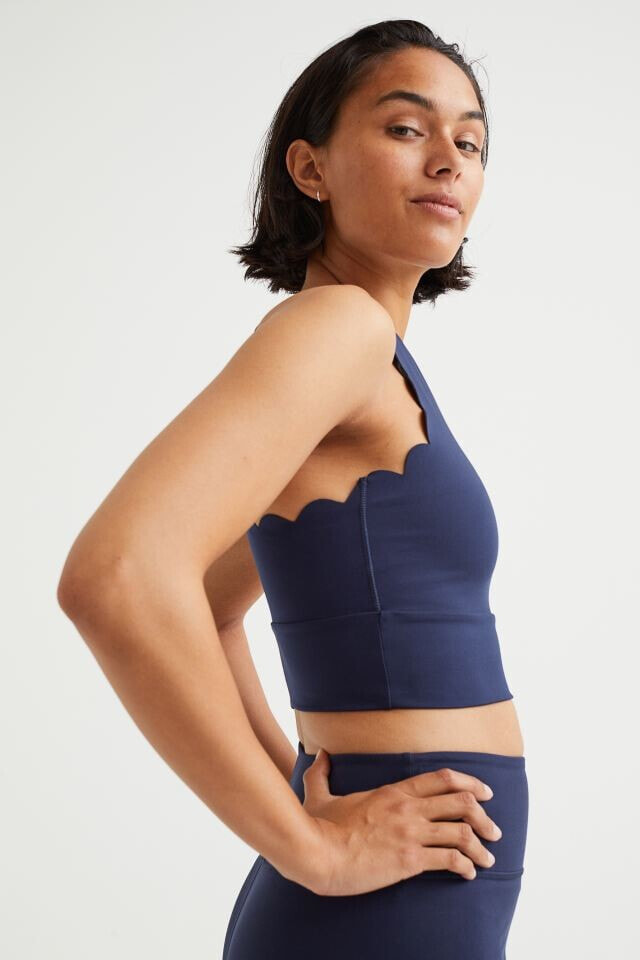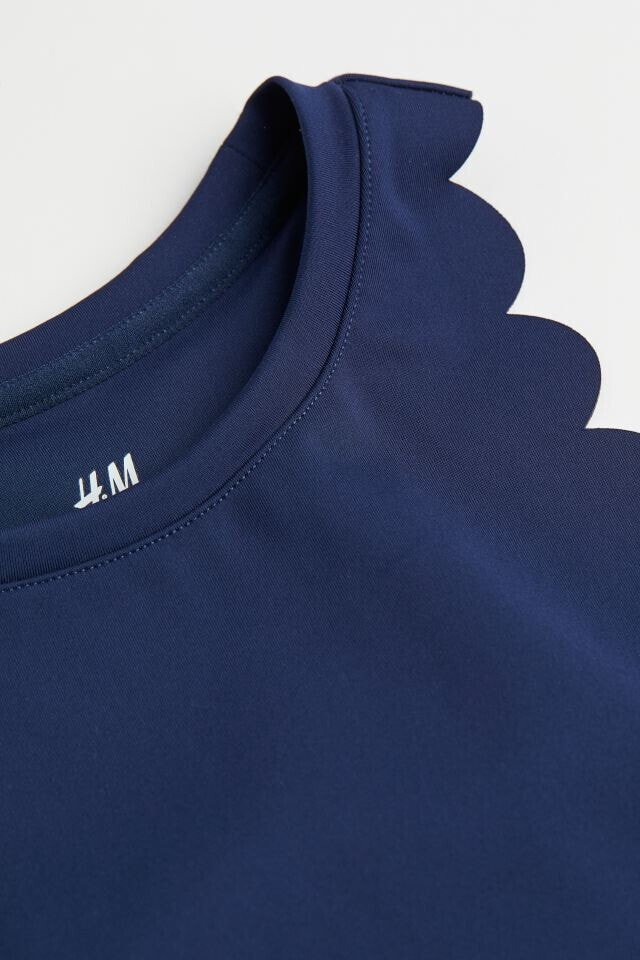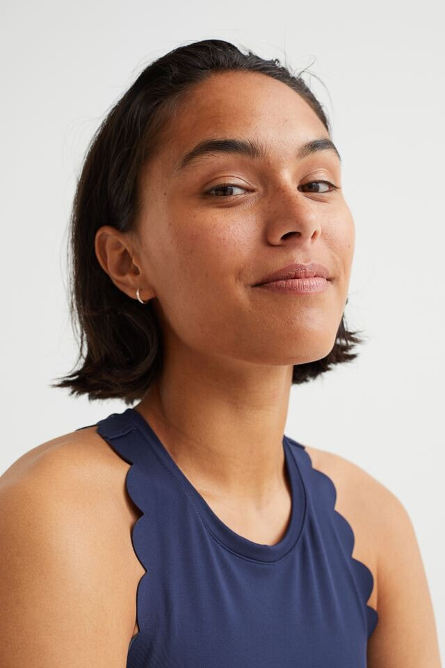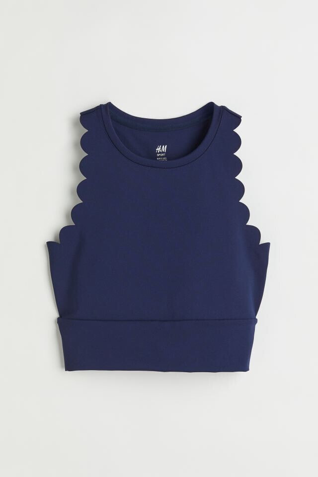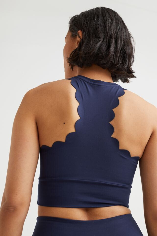 Fitted crop top in fast-drying, functional fabric to help keep you dry and cool while exercising. Narrow cut at top with a round neckline and racer back. Scalloped edges at armholes and wide trim at hem.