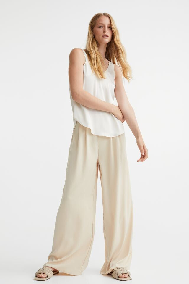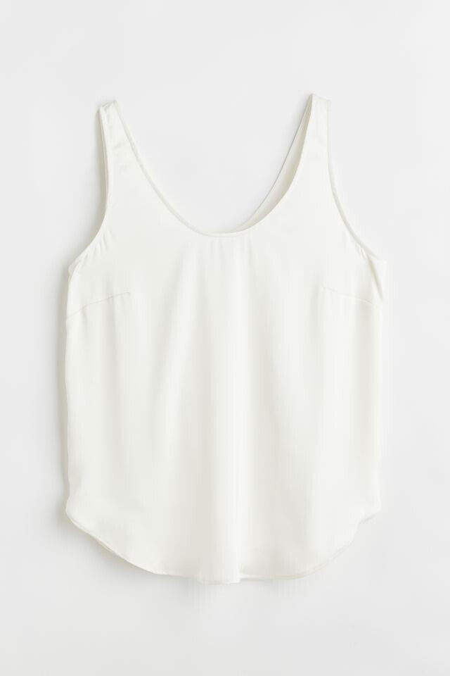 Sleeveless top in softly draped satin with a round, low-cut neckline at front and back. Rounded hem, slightly longer at back.
