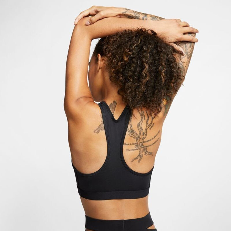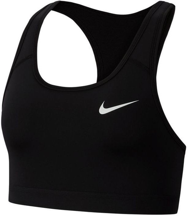 * women’s sports bra * elastic waistband under the bust * made in DRI FIT / thermoactive technology, giving off sweat to the outside * close fit wraps the body * boxer cut back allows freedom of movement * compression cut provides a supportive feel during mid-intensity workouts * composition: 82% polyester, 18% spandex * black colour The Nike Swoosh sports bra with soft cups is made of a compression material that provides support during mid-intensity workouts. The elastic waistband under the bust is smooth and comfortable.