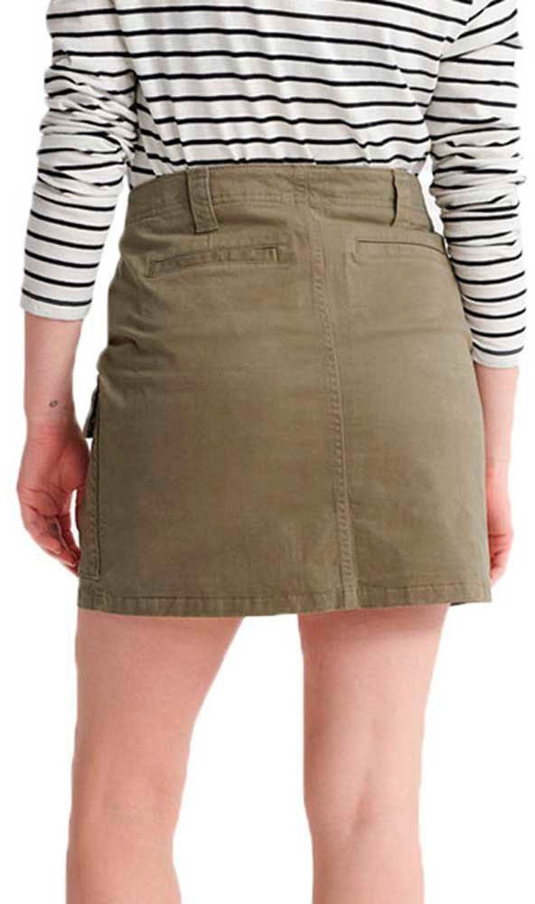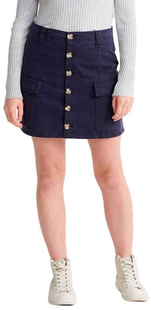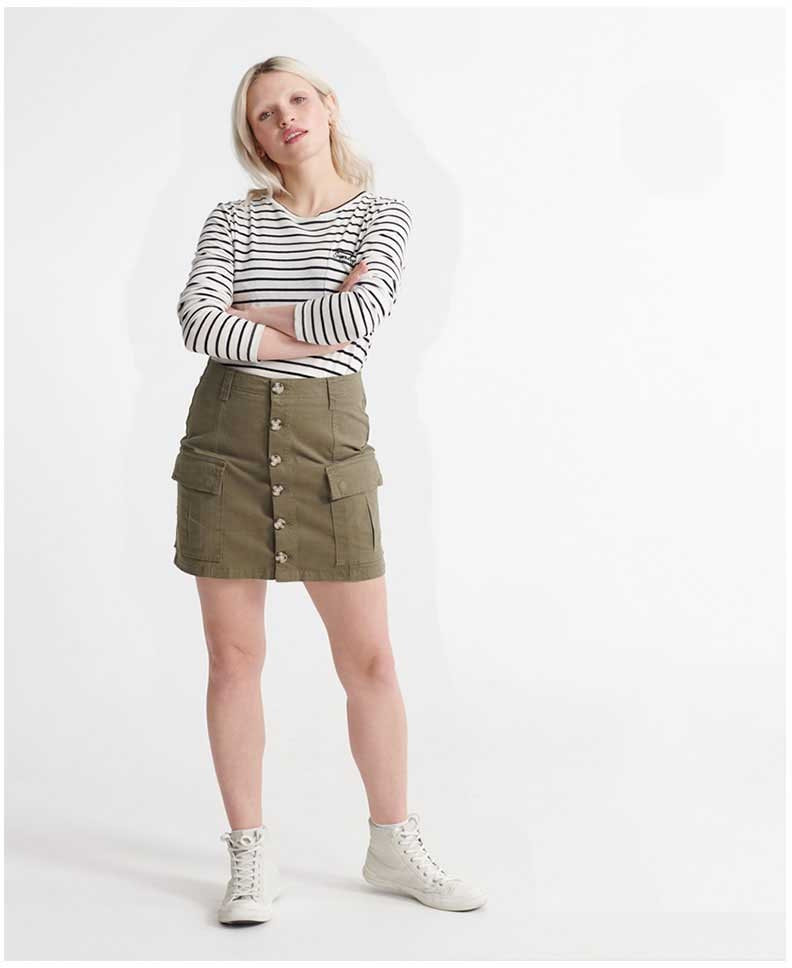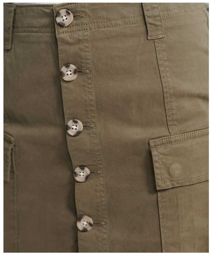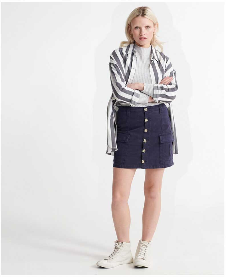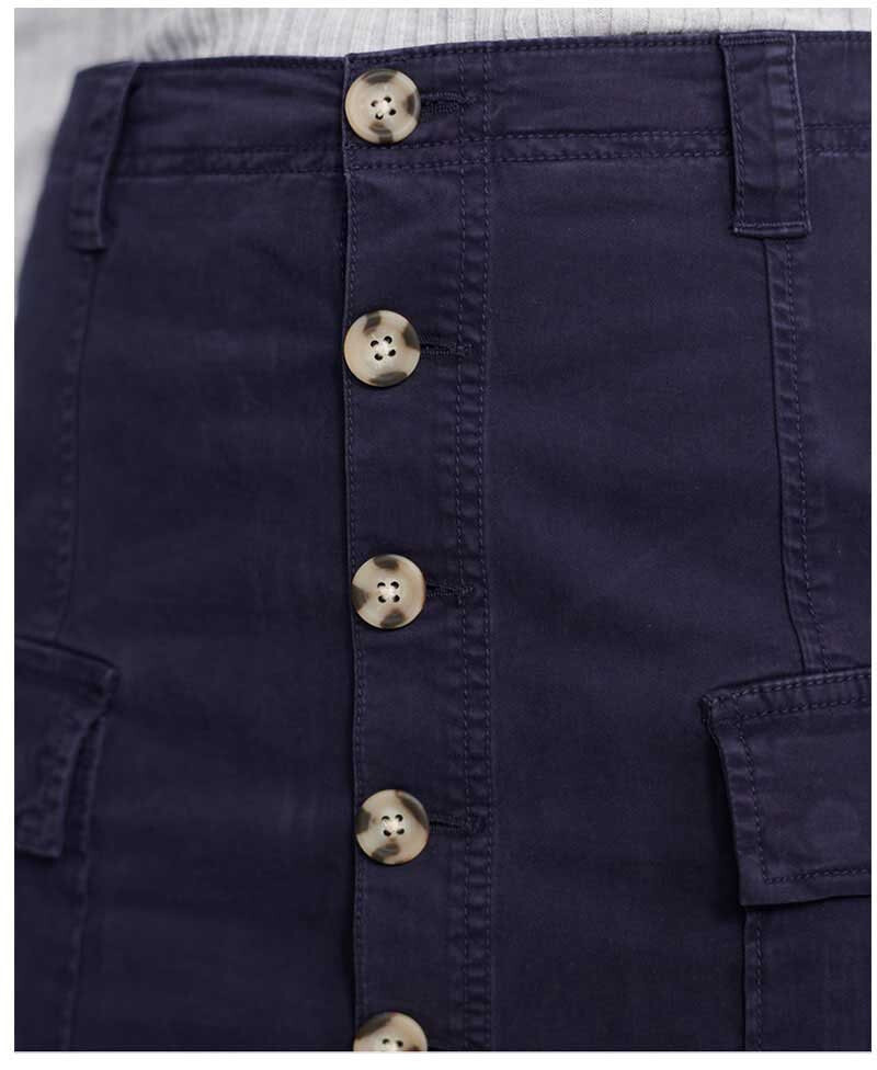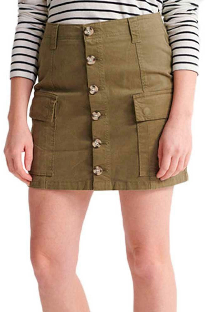 This cargo skirt features a button up fastening, two front pockets with popper fastening, belt loops and two back pockets.