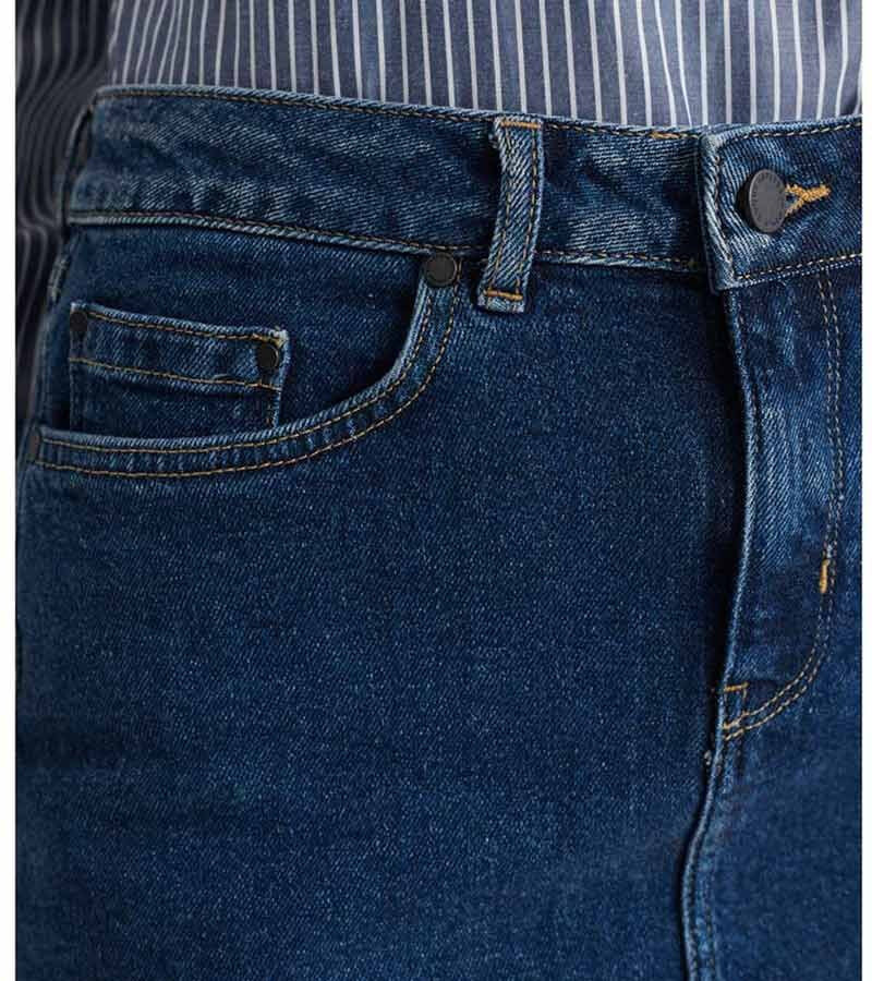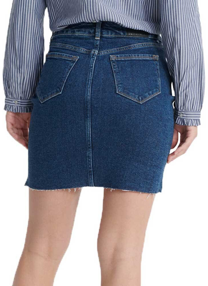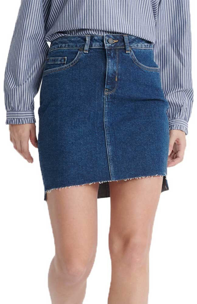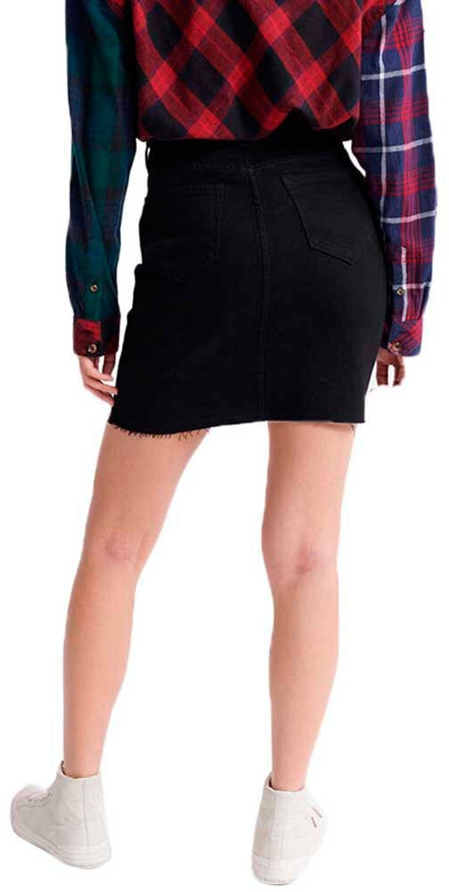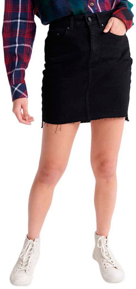 This classic denim skirt features a zip and button fastening, a five pocket design, belt loops and distressed hem.