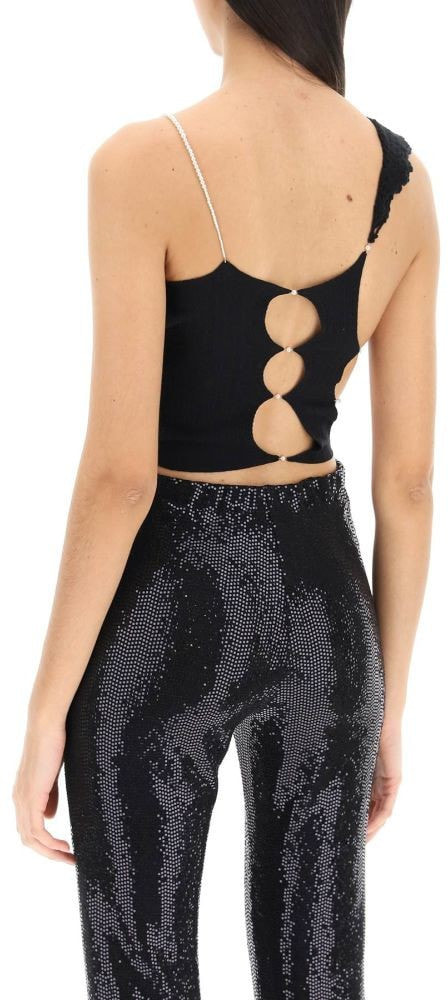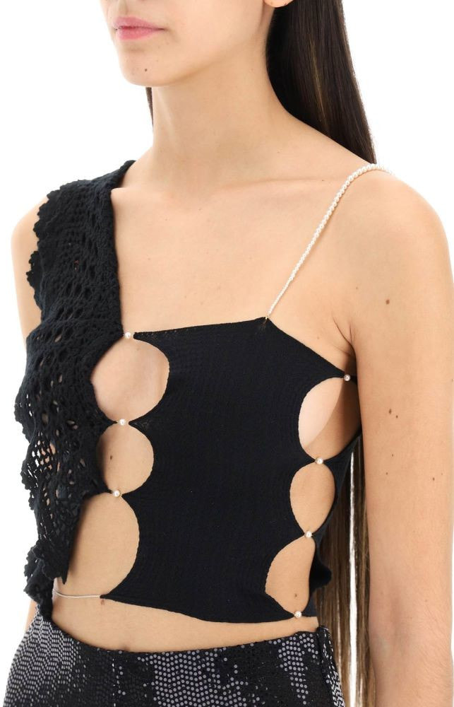 Asymmetric cropped top by Rui made of lightweight stretch knit with a crochet cashmere side panel. Finished with cut-outs and small beads all-over and with a thin chain at the hem. The model is 177 cm tall and wears a size 2.