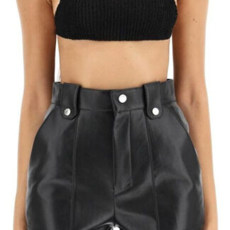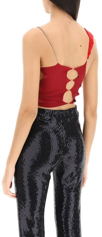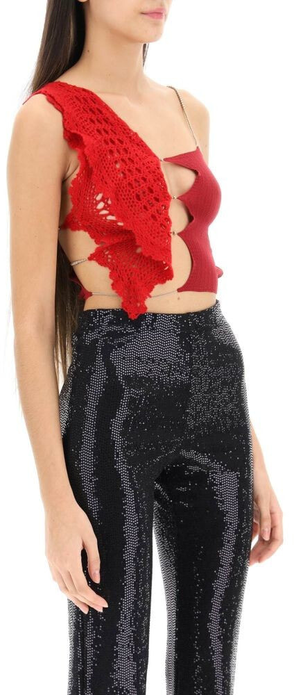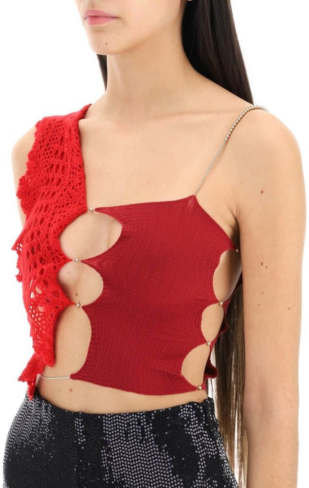 Asymmetric cropped top by Rui made of lightweight stretch knit with a crochet cashmere side panel. Finished with cut-outs and small beads all-over and with a thin chain at the hem. The model is 177 cm tall and wears a size 2.
