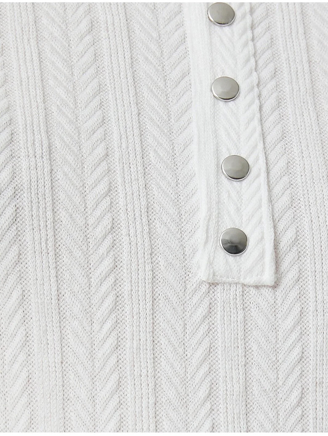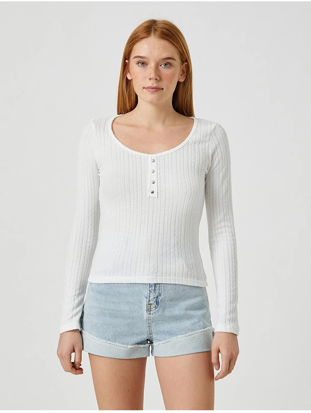 Konforu ve dinamizmi aynı potada eriten Koton Kadın Tişört modelleri stilinizin en popüler parçaları olacak. Yuvarlak yaka, düğme detaylı, uzun kollu tişört Koton yorumuyla sizlerle.