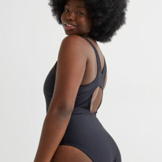 No suitcase is packed without this racerback swimsuit! Featuring a scoop neckline and open back detail with a panel design, this swimsuit is complete with padded cups and mesh tummy control to fit and flatter your curves. Slip on your flip-flops for the perfect poolside look.