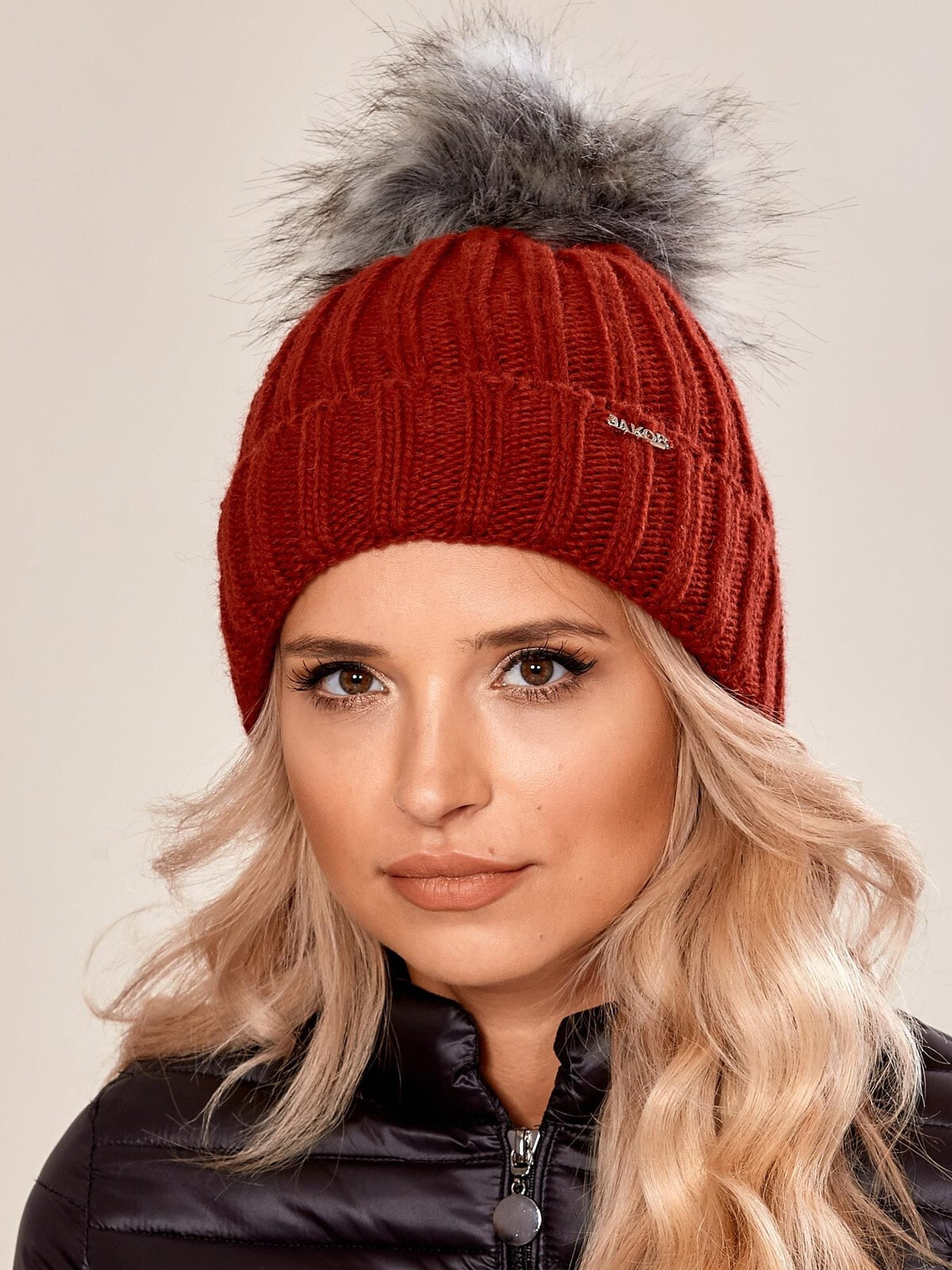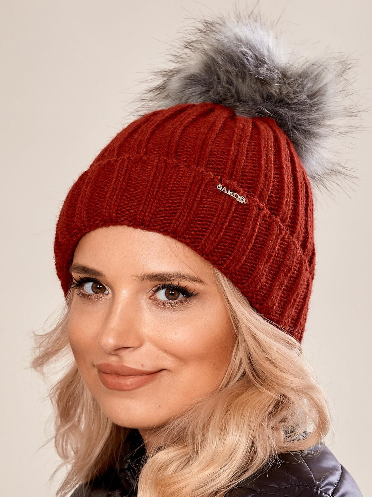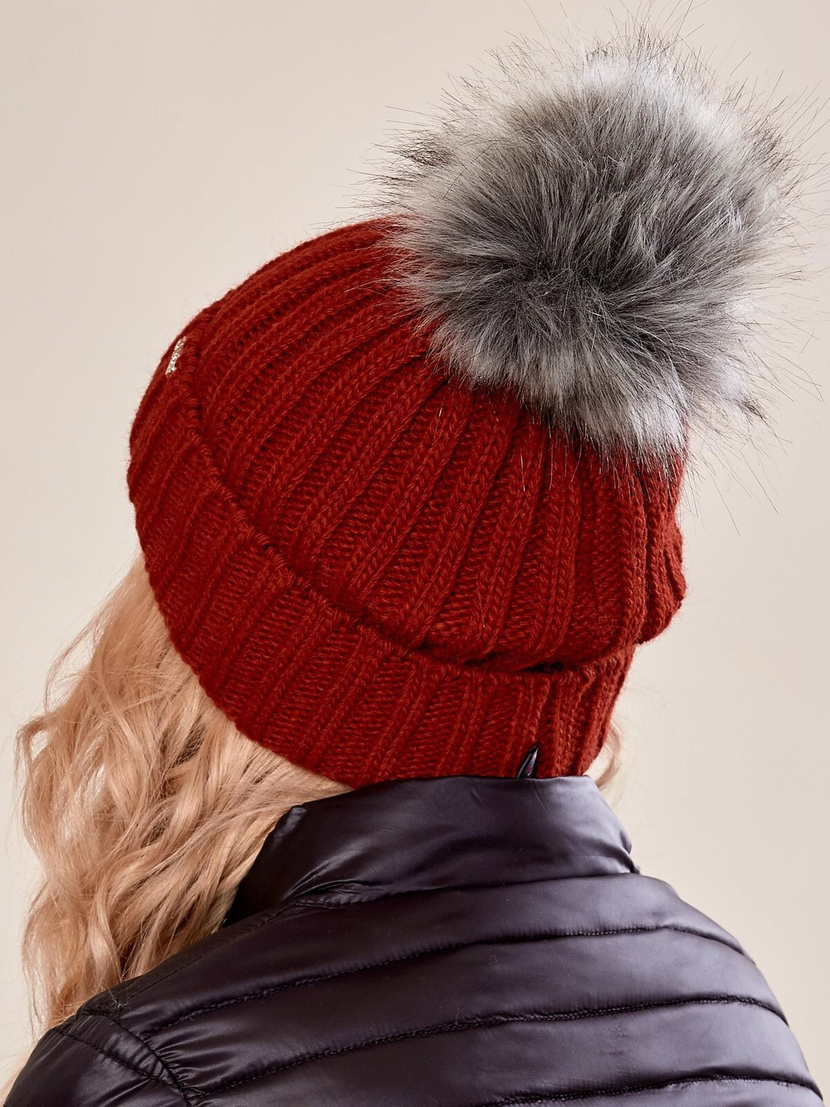 Женская вязаная шапка с подворотом и помпоном красная Factory Price