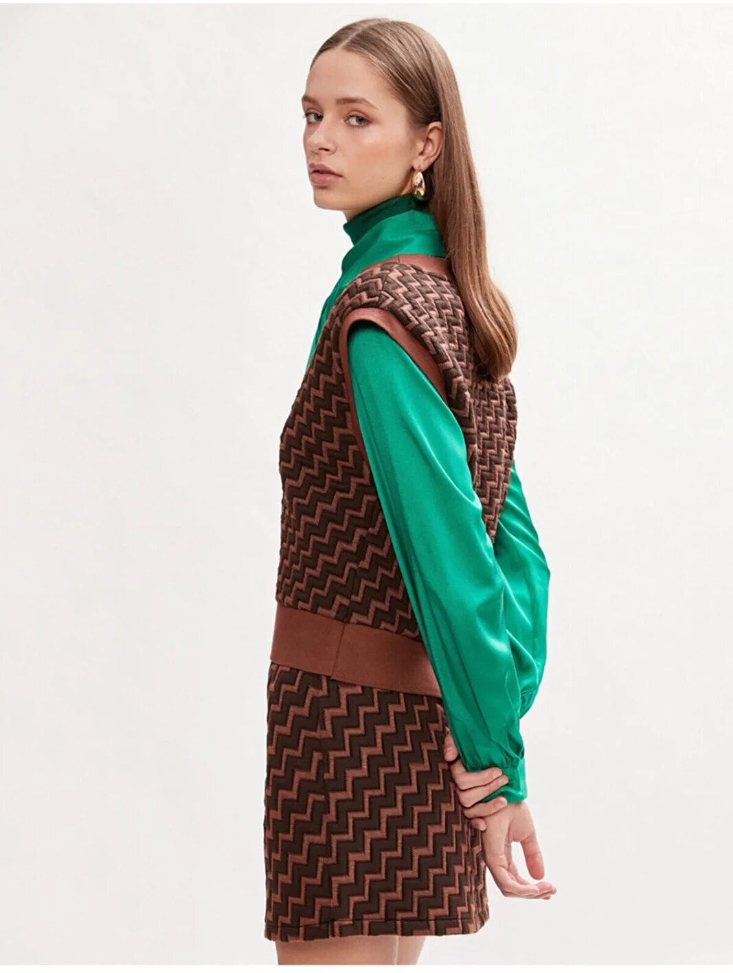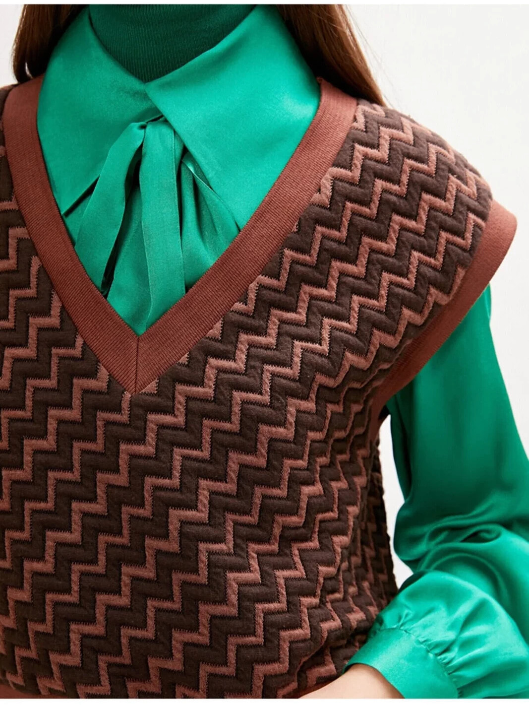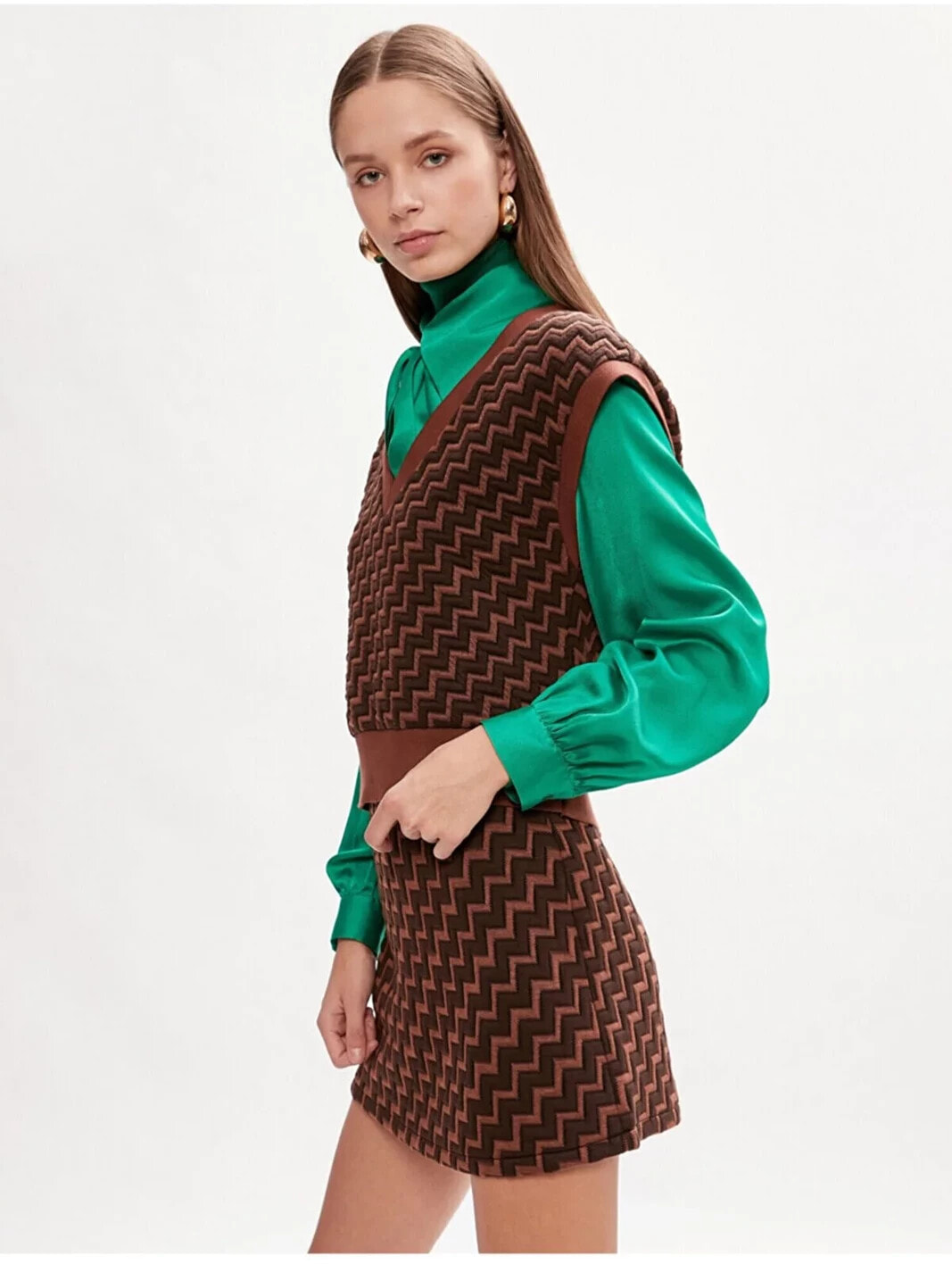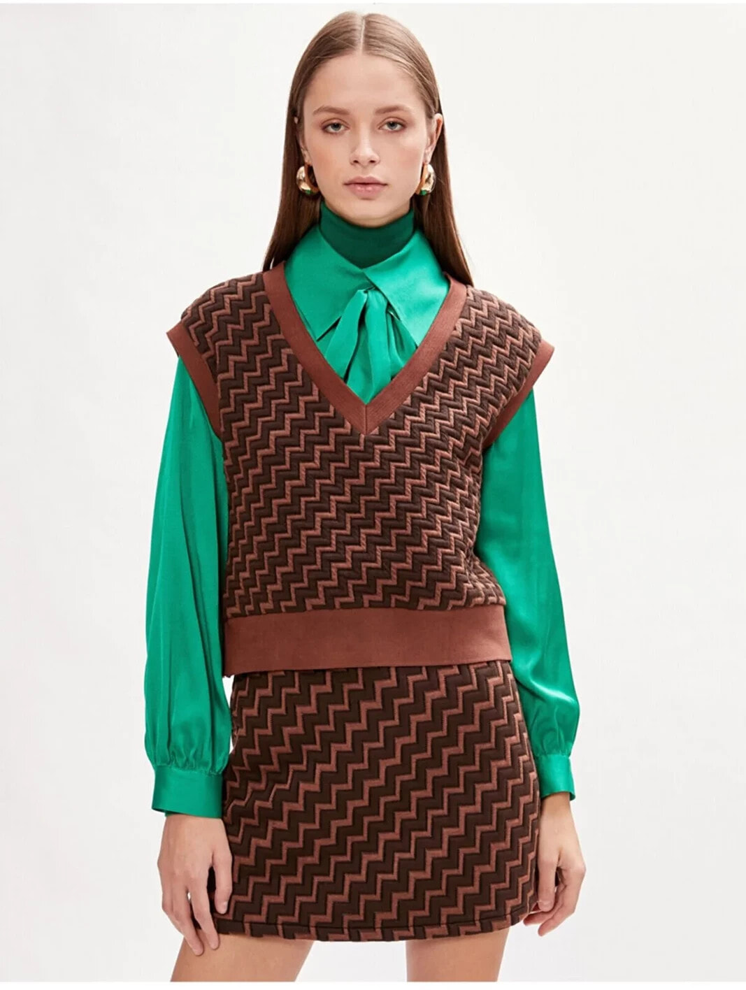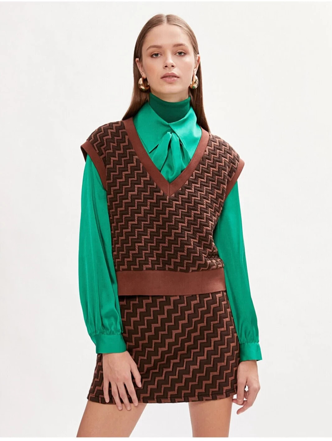 Styled By Yours Melis Agazat X Koton – Zikzak Desenli, V yaka, Kolsuz Süveter Model Bilgileri: Boy:181 cm, Göğüs:78, Bel:59, Kalça:90, Modelin Bedeni:S